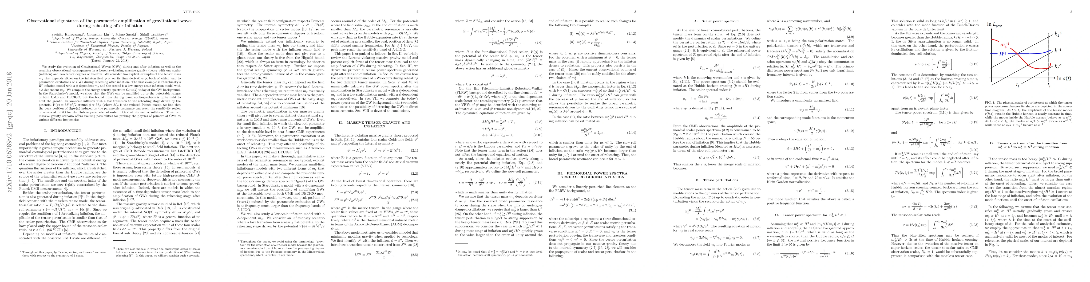 We study the evolution of Gravitational Waves (GWs) during and after inflation as well as the resulting observational consequences in a Lorentz-violating massive gravity theory with one scalar (inflaton) and two tensor degrees of freedom. We consider two explicit examples of the tensor mass $m_g$ that depends either on the inflaton field $\phi$ or on its time derivative $\dot{\phi}$, both of which lead to parametric excitations of GWs during reheating after inflation. The first example is Starobinsky's $R^2$ inflation model with a $\phi$-dependent $m_g$ and the second is a low-energy-scale inflation model with a $\dot{\phi}$-dependent $m_g$. We compute the energy density spectrum $\Omega_{\rm GW}(k)$ today of the GW background. In the Starobinsky's model, we show that the GWs can be amplified up to the detectable ranges of both CMB and DECIGO, but the bound from the big bang nucleosynthesis is quite tight to limit the growth. In low-scale inflation with a fast transition to the reheating stage driven by the potential $V(\phi)=M^2 \phi^2/2$ around $\phi \approx M_{\rm pl}$ (where $M_{\rm pl}$ is the reduced Planck mass), we find that the peak position of $\Omega_{\rm GW}(k)$ induced by the parametric resonance can reach the sensitivity region of advanced LIGO for the Hubble parameter of order 1 GeV at the end of inflation. Thus, our massive gravity scenario offers exciting possibilities for probing the physics of primordial GWs at various different frequencies.
