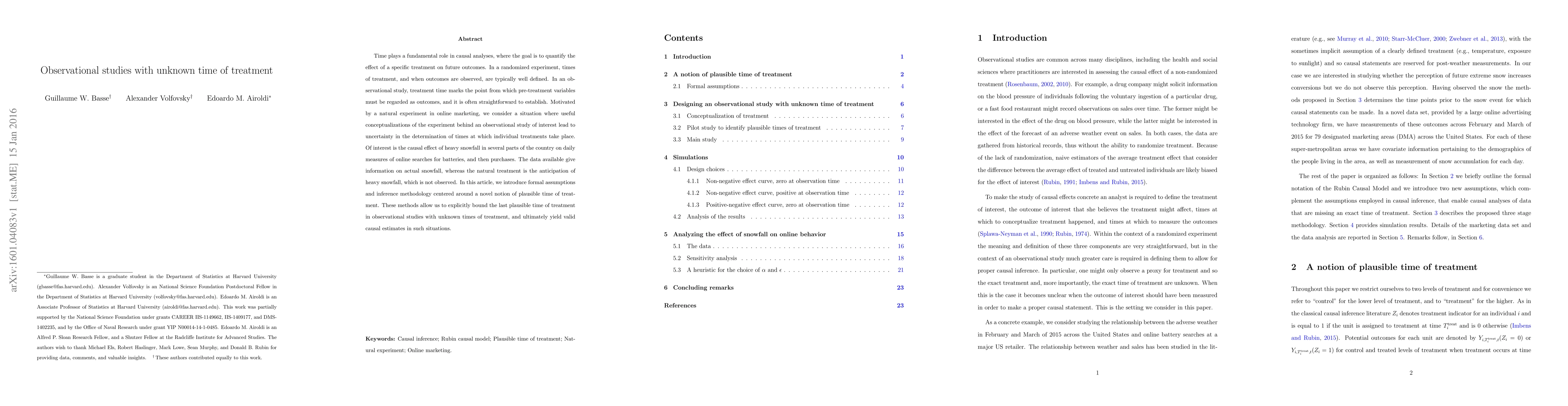Time plays a fundamental role in causal analyses, where the goal is to quantify the effect of a specific treatment on future outcomes. In a randomized experiment, times of treatment, and when outcomes are observed, are typically well defined. In an observational study, treatment time marks the point from which pre-treatment variables must be regarded as outcomes, and it is often straightforward to establish. Motivated by a natural experiment in online marketing, we consider a situation where useful conceptualizations of the experiment behind an observational study of interest lead to uncertainty in the determination of times at which individual treatments take place. Of interest is the causal effect of heavy snowfall in several parts of the country on daily measures of online searches for batteries, and then purchases. The data available give information on actual snowfall, whereas the natural treatment is the anticipation of heavy snowfall, which is not observed. In this article, we introduce formal assumptions and inference methodology centered around a novel notion of plausible time of treatment. These methods allow us to explicitly bound the last plausible time of treatment in observational studies with unknown times of treatment, and ultimately yield valid causal estimates in such situations.