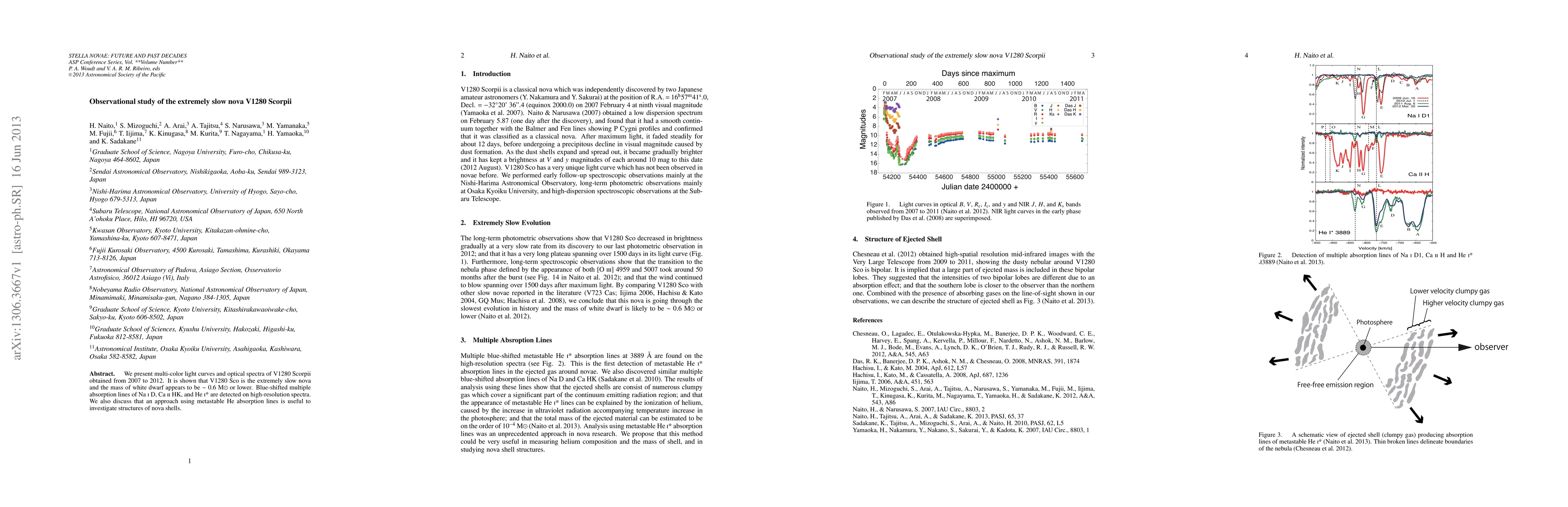 This study presents observational data of V1280 Scorpii, a slow nova with a white dwarf mass estimated at 0.6 MÐ or lower, featuring unique absorption lines that provide insight into its structure.