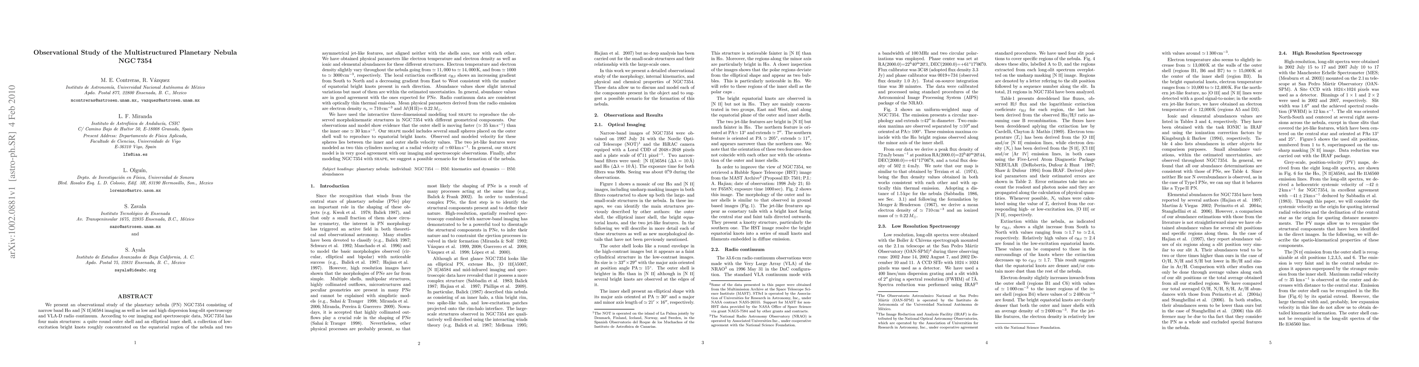 We present an observational study of the planetary nebula (PN) NGC 7354 consisting of narrowband Halpha and [NII]6584 imaging as well as low- and high-dispersion long-slit spectroscopy and VLA-D radio continuum. According to our imaging and spectroscopic data, NGC 7354 has four main structures: a quite round outer shell and an elliptical inner shell, a collection of low-excitation bright knots roughly concentrated on the equatorial region of the nebula, and two symmetrical jet-like features, not aligned either with the shells' axes, or with each other. We have obtained physical parameters like electron temperature and electron density as well as ionic and elemental abundances for these different structures. Electron temperature and electron density slightly vary throughout the nebula. The local extinction coefficient c_Hbeta shows an increasing gradient from south to north and a decreasing gradient from east to west consistent with the number of equatorial bright knots present in each direction. Abundance values show slight internal variations but most of them are within the estimated uncertainties. In general, abundance values are in good agreement with the ones expected for PNe. Radio continuum data are consistent with optically thin thermal emission. We have used the interactive three-dimensional modeling tool SHAPE to reproduce the observed morphokinematic structures in NGC 7354 with different geometrical components. Our SHAPE model is in very good agreement with our imaging and spectroscopic observations. Finally, after modeling NGC 7354 with SHAPE, we suggest a possible scenario for the formation of the nebula.