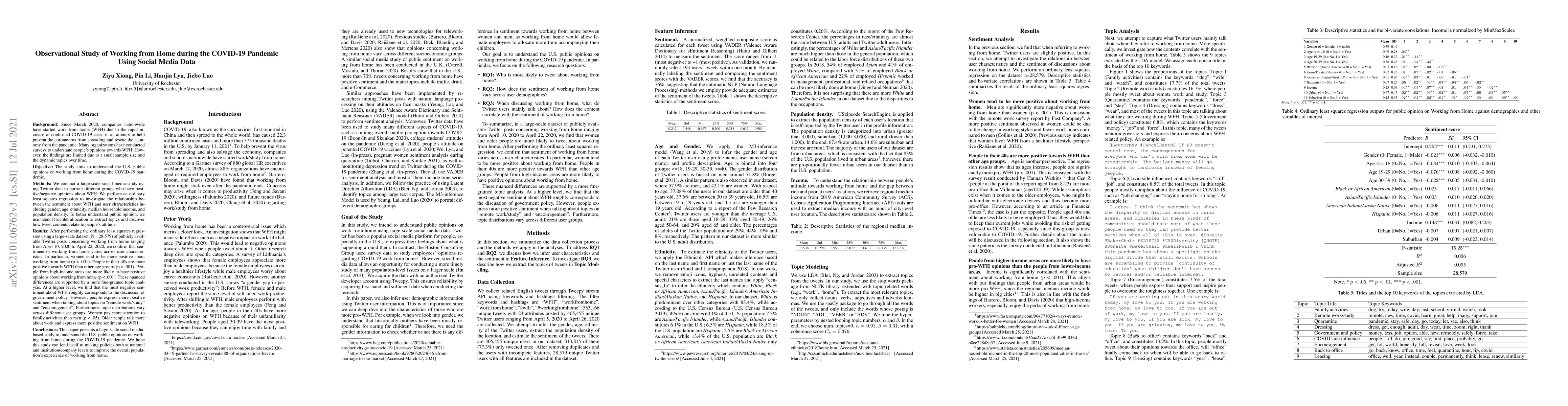 Since March 2020, companies nationwide have started work from home (WFH) due to the rapid increase of confirmed COVID-19 cases in an attempt to help prevent the coronavirus from spreading and rescue the economy from the pandemic. Many organizations have conducted surveys to understand people's opinions towards WFH. However, the findings are limited due to small sample size and the dynamic topics over time. This study aims to understand the U.S. public opinions on working from home during the COVID-19 pandemic. We conduct a large-scale social media study using Twitter data to portrait different groups who have positive/negative opinions about WFH. We perform an ordinary least squares regression to investigate the relationship between the sentiment about WFH and user characteristics including gender, age, ethnicity, median household income, and population density. To better understand public opinion, we use latent Dirichlet allocation to extract topics and discover how tweet contents relate to people's attitudes. These findings provide evidence that sentiment about WFH varies across user characteristics. Furthermore, the content analysis sheds light on the nuanced differences in sentiment and reveals disparities relate to WFH.