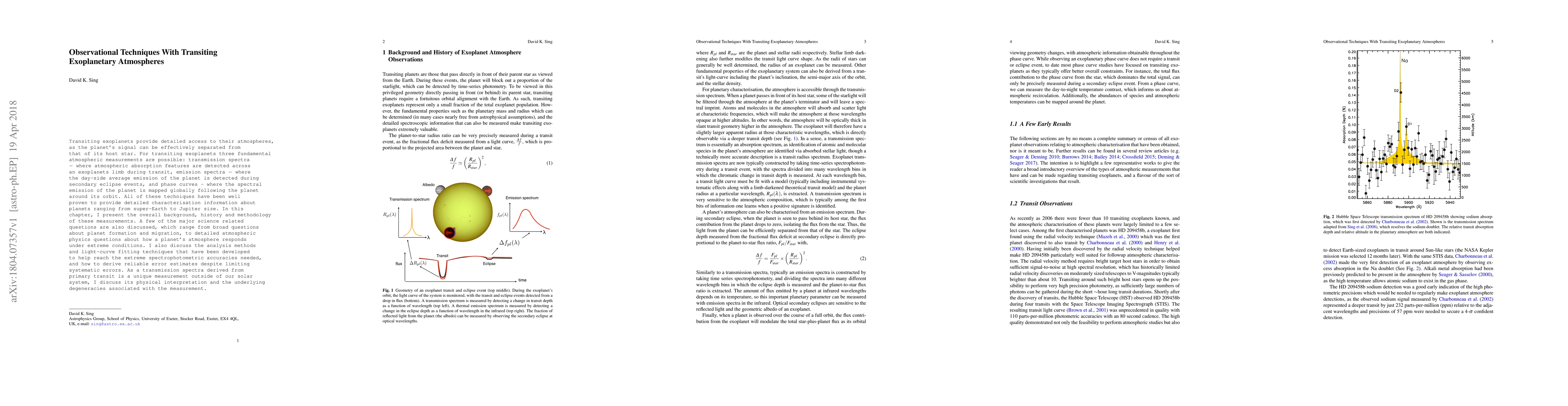 This paper provides an in-depth overview of observational techniques for studying transiting exoplanetary atmospheres, including transmission, emission spectra, and phase curves, and discusses their applications in understanding planet formation, migration, and atmospheric physics. It also covers the methodologies and analysis techniques used to achieve high-precision spectrophotometry and reliable error estimation.