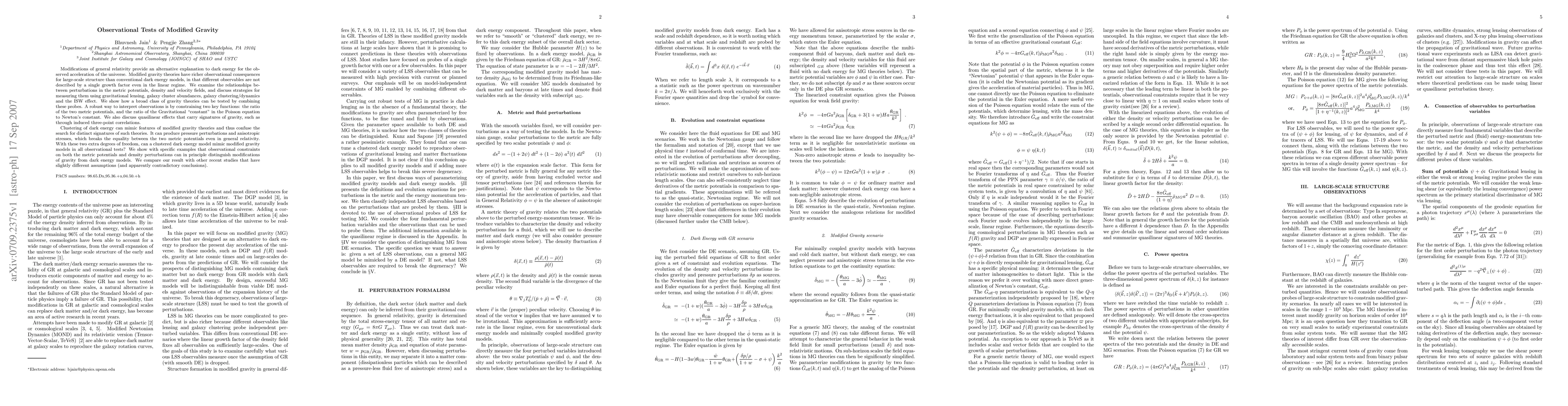Modified gravity theories have richer observational consequences for large-scale structure than conventional dark energy models, in that different observables are not described by a single growth factor even in the linear regime. We examine the relationships between perturbations in the metric potentials, density and velocity fields, and discuss strategies for measuring them using gravitational lensing, galaxy cluster abundances, galaxy clustering/dynamics and the ISW effect. We show how a broad class of gravity theories can be tested by combining these probes. A robust way to interpret observations is by constraining two key functions: the ratio of the two metric potentials, and the ratio of the Gravitational ``constant'' in the Poisson equation to Newton's constant. We also discuss quasilinear effects that carry signatures of gravity, such as through induced three-point correlations. Clustering of dark energy can mimic features of modified gravity theories and thus confuse the search for distinct signatures of such theories. It can produce pressure perturbations and anisotropic stresses, which breaks the equality between the two metric potentials even in general relativity. With these two extra degrees of freedom, can a clustered dark energy model mimic modified gravity models in all observational tests? We show with specific examples that observational constraints on both the metric potentials and density perturbations can in principle distinguish modifications of gravity from dark energy models. We compare our result with other recent studies that have slightly different assumptions (and apparently contradictory conclusions).