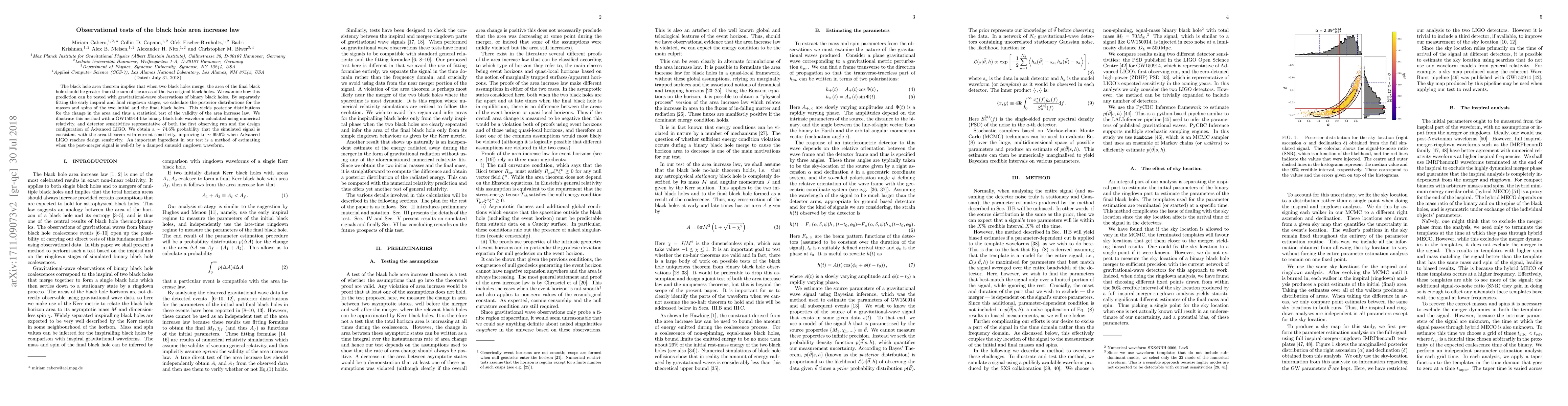 The black hole area theorem implies that when two black holes merge, the area of the final black hole should be greater than the sum of the areas of the two original black holes. We examine how this prediction can be tested with gravitational-wave observations of binary black holes. By separately fitting the early inspiral and final ringdown stages, we calculate the posterior distributions for the masses and spins of the two initial and the final black holes. This yields posterior distributions for the change in the area and thus a statistical test of the validity of the area increase law. We illustrate this method with a GW150914-like binary black hole waveform calculated using numerical relativity, and detector sensitivities representative of both the first observing run and the design configuration of Advanced LIGO. We obtain a $\sim74.6\%$ probability that the simulated signal is consistent with the area theorem with current sensitivity, improving to $\sim99.9\%$ when Advanced LIGO reaches design sensitivity. An important ingredient in our test is a method of estimating when the post-merger signal is well-fit by a damped sinusoid ringdown waveform.