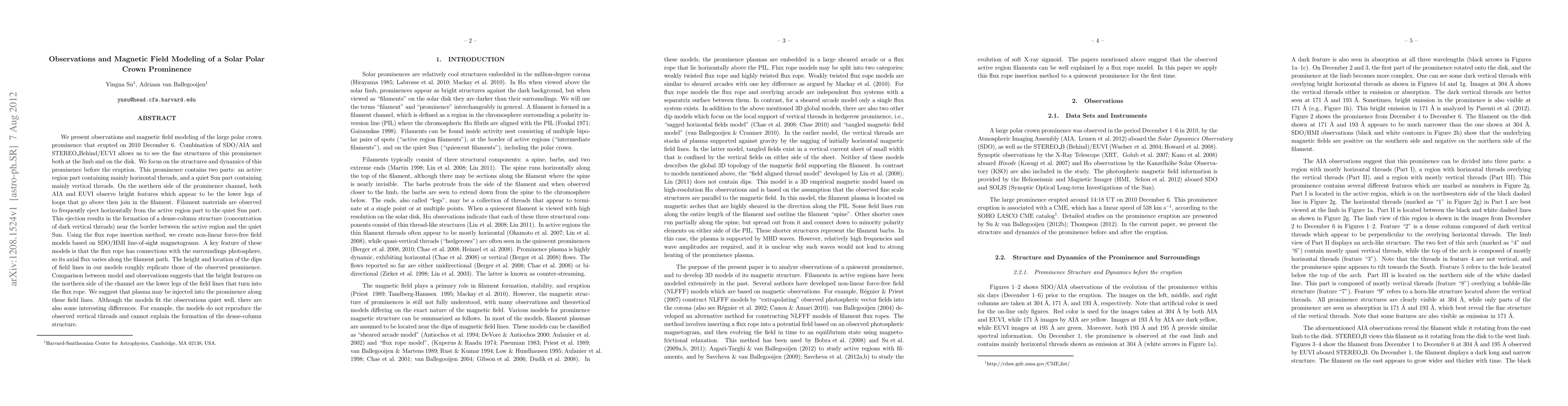 This paper presents observations and magnetic field modeling of a solar polar crown prominence that erupted in December 2010, using data from SDO/AIA and STEREO/EUVI. The models suggest the prominence's flux rope is connected to the photosphere, with axial flux varying along the filament path, but they cannot fully explain the observed vertical threads and dense-column structure.