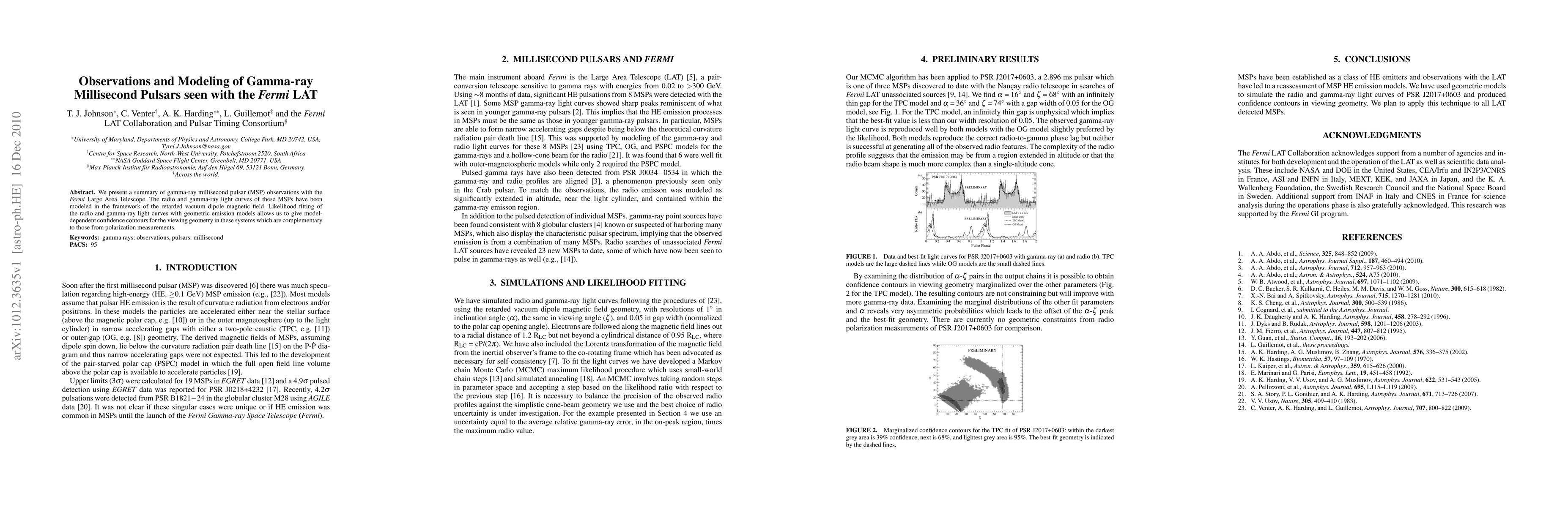 This paper summarizes observations of gamma-ray millisecond pulsars using the Fermi Large Area Telescope and models their radio and gamma-ray light curves within a retarded vacuum dipole magnetic field framework. The study provides model-dependent confidence contours for the viewing geometry of these pulsars, complementing results from polarization measurements.