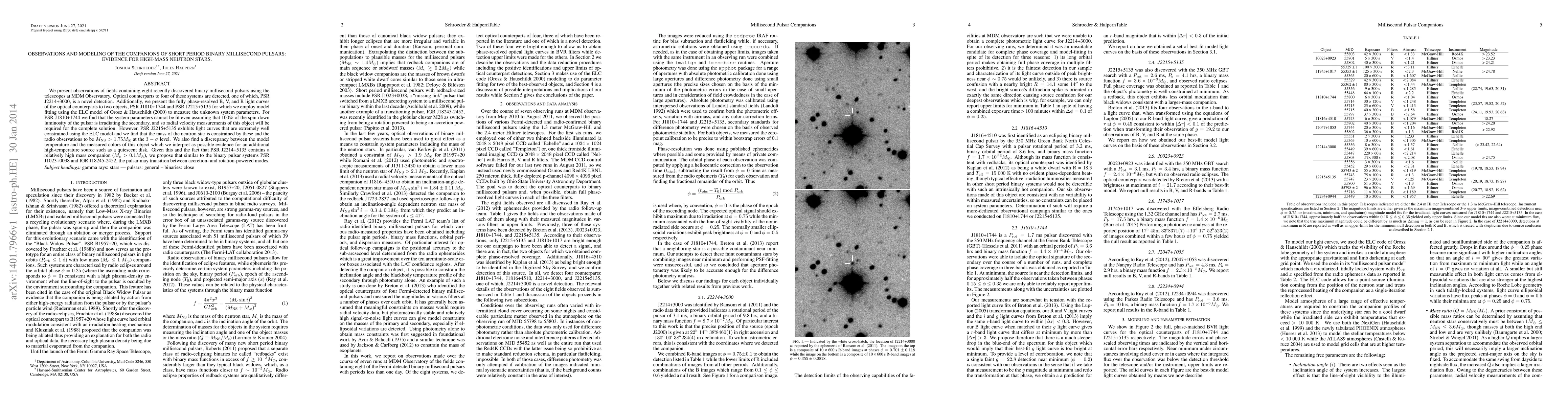 We present observations of fields containing eight recently discovered binary millisecond pulsars using the telescopes at MDM Observatory. Optical counterparts to four of these systems are detected, one of which, PSR J2214+3000, is a novel detection. Additionally, we present the fully phase-resolved B, V, and R light curves of the optical counterparts to two objects, PSR J1810+1744 and PSR J2215+5135 for which we employ model fitting using the ELC model of Orosz & Hauschildt (2000) to measure the unknown system parameters. For PSR J1810+1744 we find that the system parameters cannot be fit even assuming that 100% of the spin-down luminosity of the pulsar is irradiating the secondary, and so radial velocity measurements of this object will be required for the complete solution. However, PSR J2215+5135 exhibits light curves that are extremely well constrained using the ELC model and we find that the mass of the neutron star is constrained by these and the radio observations to be greater than 1.75 solar masses at the 3-sigma level. We also find a discrepancy between the model temperature and the measured colors of this object which we interpret as possible evidence for an additional high-temperature source such as a quiescent disk. Given this and the fact that PSR J2214+5135 contains a relatively high mass companion (greater than 0.1 solar masses), we propose that similar to the binary pulsar systems PSR J1023+0038 and IGR J18245-2452, the pulsar may transition between accretion- and rotation-powered modes.