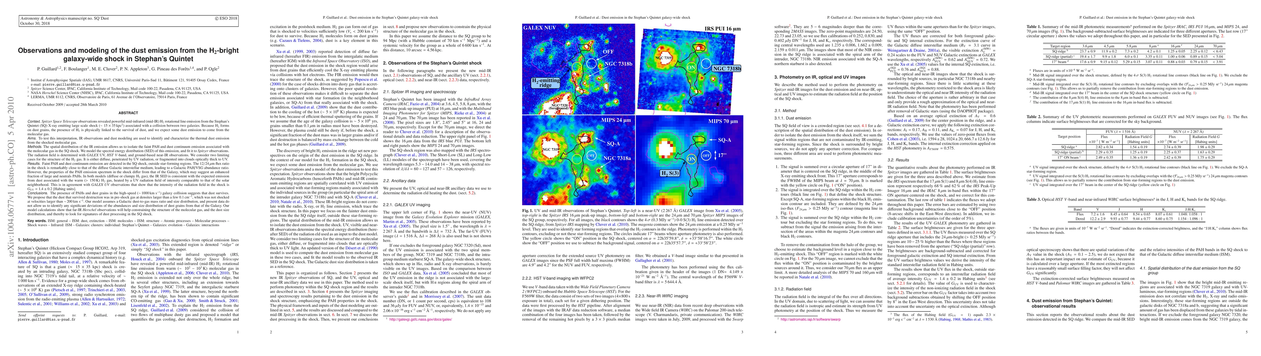 Spitzer Space Telescope observations revealed powerful mid-infrared (mid-IR) H2 rotational line emission from the Stephan's Quintet (SQ) X-ray emitting large scale shock associated with a collision between two galaxies. Because H2 forms on dust grains, the presence of H2 is physically linked to the survival of dust, and we expect some dust emission to come from the molecular gas. To test this interpretation, IR observations and dust modeling are used to identify and characterize the thermal dust emission from the shocked molecular gas. The spatial distribution of the IR emission allows us to isolate the faint PAH and dust continuum emission associated with the molecular gas in the SQ shock. We model the spectral energy distribution (SED) of this emission, and fit it to Spitzer observations. Faint PAH and dust continuum emission are detected in the SQ shock, outside star-forming regions. The 12/24um flux ratio in the shock is remarkably close to that of the diffuse Galactic interstellar medium, leading to a Galactic PAH/VSG abundance ratio. However, the properties of the PAH emission spectrum in the shock differ from that of the Galaxy, which may suggest an enhanced fraction of large and neutrals PAHs. The IR SED is consistent with the expected emission from dust associated with the warm (>150K) H2 gas, heated by a UV radiation field of intensity comparable to that of the solar neighborhood, in agreement with GALEX UV observations. The presence of PAHs and dust grains in the high-speed (1000km/s) galaxy collision suggests that dust survives. We propose that the dust that survived destruction was in pre-shock gas at densites larger than a few 0.1cm-3, which was not shocked at velocities larger than 200km/s. [abridged]