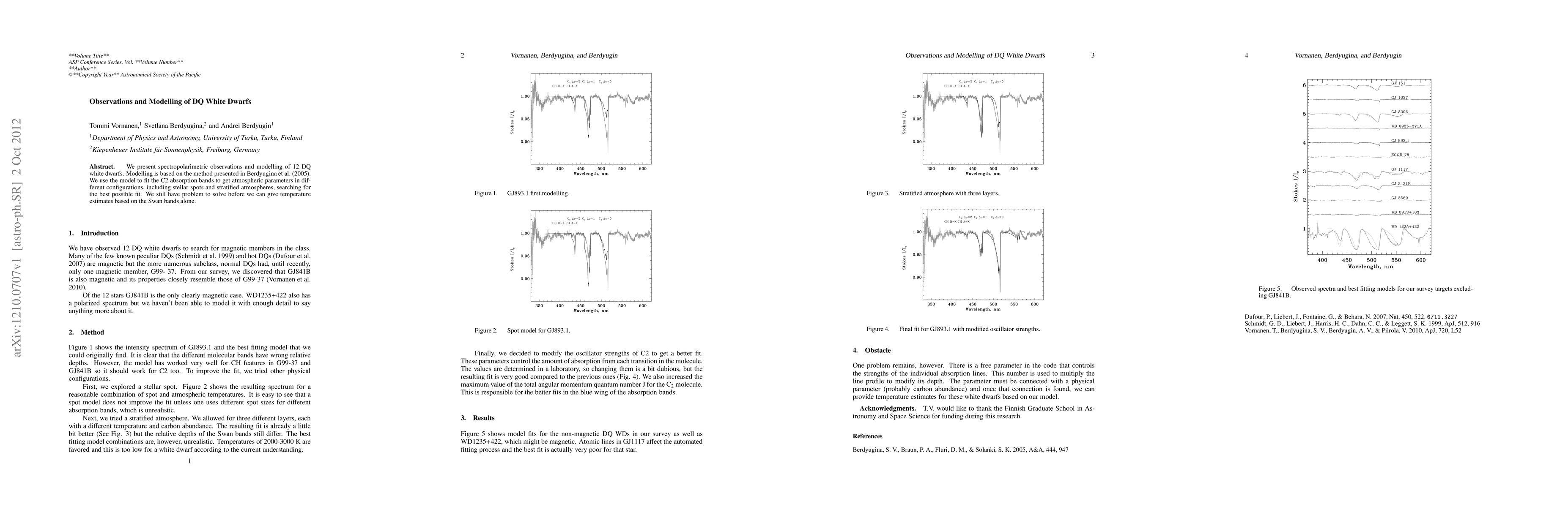 We present spectropolarimetric observations and modelling of 12 DQ white dwarfs. Modelling is based on the method presented in Berdyugina et al. (2005). We use the model to fit the C_2 absorption bands to get atmospheric parameters in different configurations, including stellar spots and stratified atmospheres, searching for the best possible fit. We still have problem to solve before we can give temperature estimates based on the Swan bands alone.