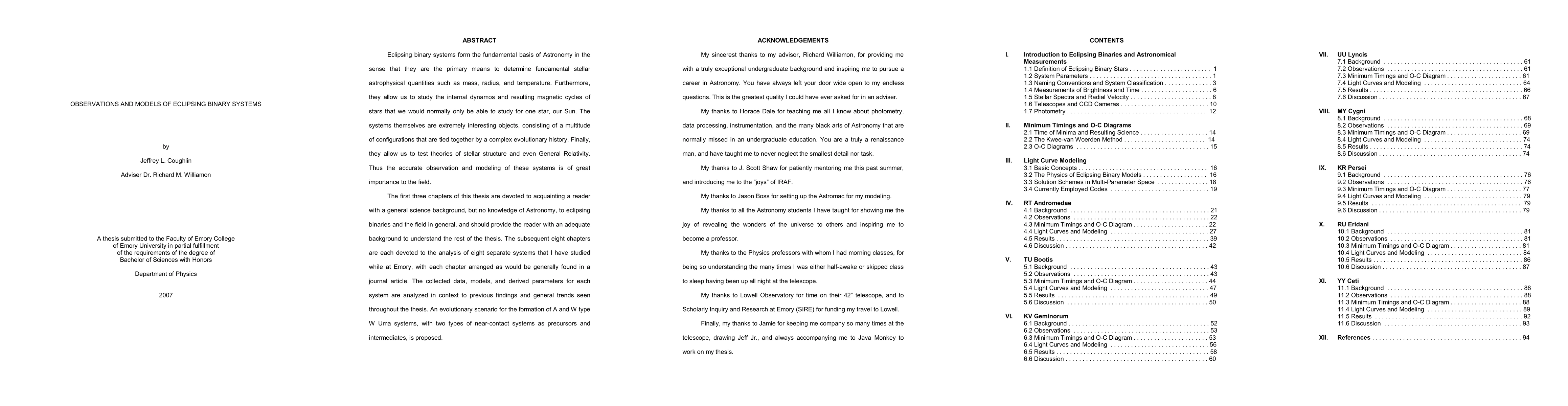Eclipsing binary systems form the fundamental basis of Astronomy in the sense that they are the primary means to determine fundamental stellar astrophysical quantities such as mass, radius, and temperature. Furthermore, they allow us to study the internal dynamos and resulting magnetic cycles of stars that we would normally only be able to study for one star, our Sun. The systems themselves are extremely interesting objects, consisting of a multitude of configurations that are tied together by a complex evolutionary history. Finally, they allow us to test theories of stellar structure and even General Relativity. Thus the accurate observation and modeling of these systems is of great importance to the field. The first three chapters of this thesis are devoted to acquainting a reader with a general science background, but no knowledge of Astronomy, to eclipsing binaries and the field in general, and should provide the reader with an adequate background to understand the rest of the thesis. The subsequent eight chapters are each devoted to the analysis of eight separate systems, (RT And, TU Boo, KV Gem, UU Lyn, MY Cyg, KR Per, RU Eri, and YY Cet), with each chapter arranged as would be generally found in a journal article. The collected data, models, and derived parameters for each system are analyzed in context to previous findings and general trends seen throughout the thesis. An evolutionary scenario for the formation of A and W type W Uma systems, with two types of near-contact systems as precursors and intermediates, is proposed.