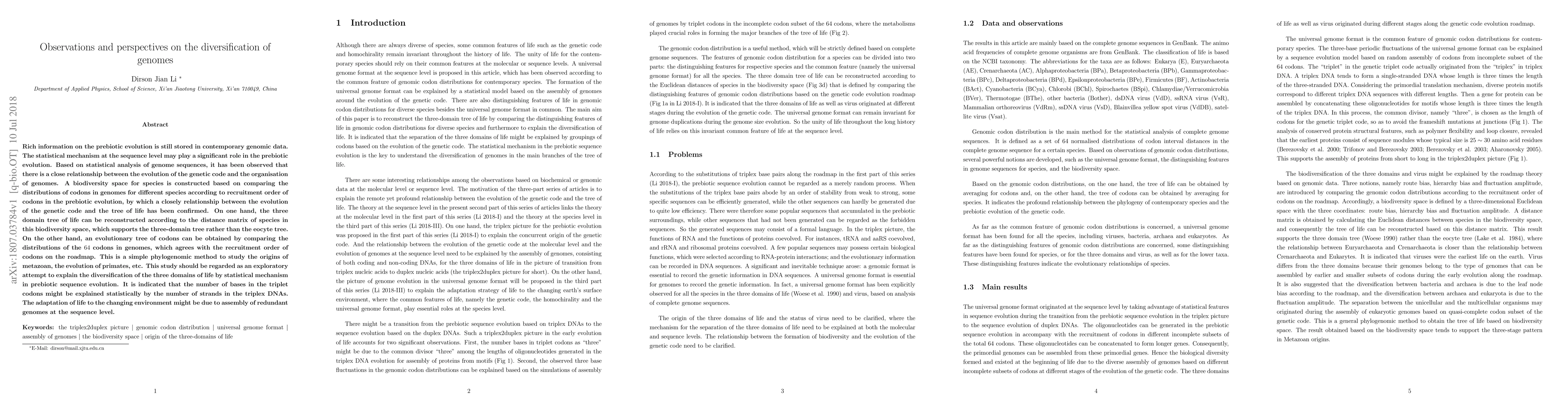 Rich information on the prebiotic evolution is still stored in contemporary genomic data. The statistical mechanism at the sequence level may play a significant role in the prebiotic evolution. Based on statistical analysis of genome sequences, it has been observed that there is a close relationship between the evolution of the genetic code and the organisation of genomes. A biodiversity space for species is constructed based on comparing the distributions of codons in genomes for different species according to recruitment order of codons in the prebiotic evolution, by which a closely relationship between the evolution of the genetic code and the tree of life has been confirmed. On one hand, the three domain tree of life can be reconstructed according to the distance matrix of species in this biodiversity space, which supports the three-domain tree rather than the eocyte tree. On the other hand, an evolutionary tree of codons can be obtained by comparing the distributions of the 64 codons in genomes, which agrees with the recruitment order of codons on the roadmap. This is a simple phylogenomic method to study the origins of metazoan, the evolution of primates, etc. This study should be regarded as an exploratory attempt to explain the diversification of the three domains of life by statistical mechanism in prebiotic sequence evolution. It is indicated that the number of bases in the triplet codons might be explained statistically by the number of strands in the triplex DNAs. The adaptation of life to the changing environment might be due to assembly of redundant genomes at the sequence level.