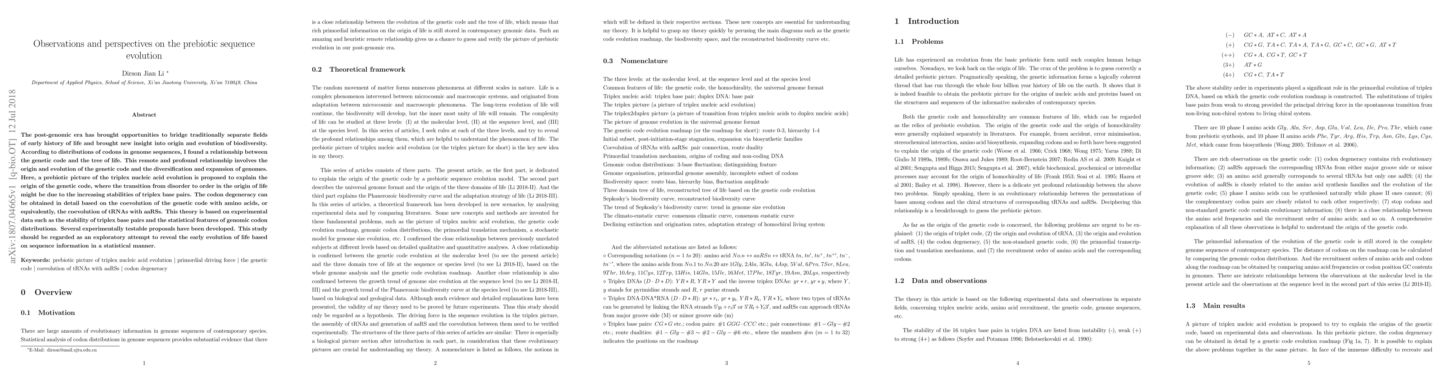 The post-genomic era has brought opportunities to bridge traditionally separate fields of early history of life and brought new insight into origin and evolution of biodiversity. According to distributions of codons in genome sequences, I found a relationship between the genetic code and the tree of life. This remote and profound relationship involves the origin and evolution of the genetic code and the diversification and expansion of genomes. Here, a prebiotic picture of the triplex nucleic acid evolution is proposed to explain the origin of the genetic code, where the transition from disorder to order in the origin of life might be due to the increasing stabilities of triplex base pairs. The codon degeneracy can be obtained in detail based on the coevolution of the genetic code with amino acids, or equivalently, the coevolution of tRNAs with aaRSs. This theory is based on experimental data such as the stability of triplex base pairs and the statistical features of genomic codon distributions. Several experimentally testable proposals have been developed. This study should be regarded as an exploratory attempt to reveal the early evolution of life based on sequence information in a statistical manner.