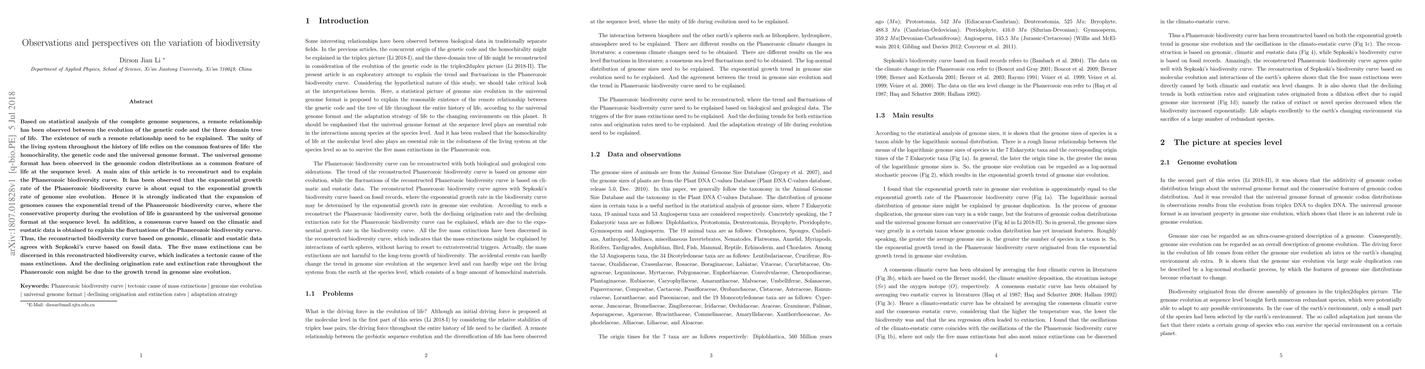 Based on statistical analysis of the complete genome sequences, a remote relationship has been observed between the evolution of the genetic code and the three domain tree of life. The existence of such a remote relationship need to be explained. The unity of the living system throughout the history of life relies on the common features of life: the homochirality, the genetic code and the universal genome format. The universal genome format has been observed in the genomic codon distributions as a common feature of life at the sequence level. A main aim of this article is to reconstruct and to explain the Phanerozoic biodiversity curve. It has been observed that the exponential growth rate of the Phanerozoic biodiversity curve is about equal to the exponential growth rate of genome size evolution. Hence it is strongly indicated that the expansion of genomes causes the exponential trend of the Phanerozoic biodiversity curve, where the conservative property during the evolution of life is guaranteed by the universal genome format at the sequence level. In addition, a consensus curve based on the climatic and eustatic data is obtained to explain the fluctuations of the Phanerozoic biodiversity curve. Thus, the reconstructed biodiversity curve based on genomic, climatic and eustatic data agrees with Sepkoski's curve based on fossil data. The five mass extinctions can be discerned in this reconstructed biodiversity curve, which indicates a tectonic cause of the mass extinctions. And the declining origination rate and extinction rate throughout the Phanerozoic eon might be due to the growth trend in genome size evolution.