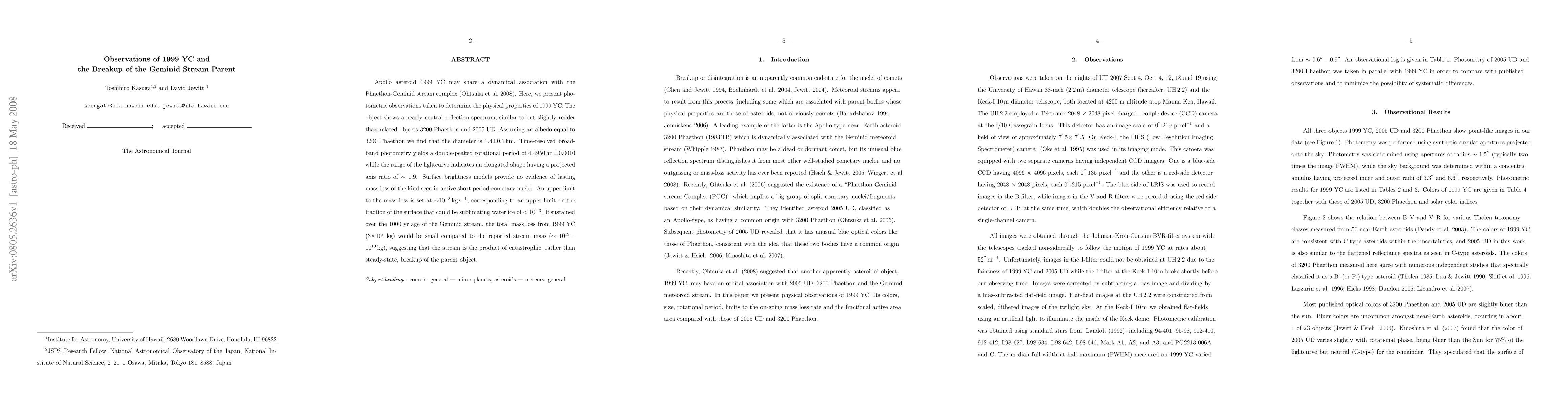 Apollo asteroid 1999 YC may share a dynamical association with the Phaethon-Geminid stream complex (Ohtsuka et al. 2008). Here, we present photometric observations taken to determine the physical properties of 1999 YC. The object shows a nearly neutral reflection spectrum, similar to but slightly redder than related objects 3200 Phaethon and 2005 UD. Assuming an albedo equal to 3200 Phaethon's we find that the diameter is 1.4+/-0.1 km. Time-resolved broad-band photometry yields a double-peaked rotational period of 4.4950+/-0.0010 hr while the range of the lightcurve indicates an elongated shape having a projected axis ratio near 1.9:1. Surface brightness models provide no evidence of lasting mass loss of the kind seen in active short period cometary nuclei. An upper limit to the mass loss is set at about 0.001 kg/s, corresponding to an upper limit on the fraction of the surface that could be sublimating water ice of 0.001. If sustained over the 1000 yr age of the Geminid stream, the total mass loss from 1999 YC (3e7 kg) would be small compared to the reported stream mass (1e12 - 1e13 kg), suggesting that the stream is the product of catastrophic, rather than steady-state, breakup of the parent object.