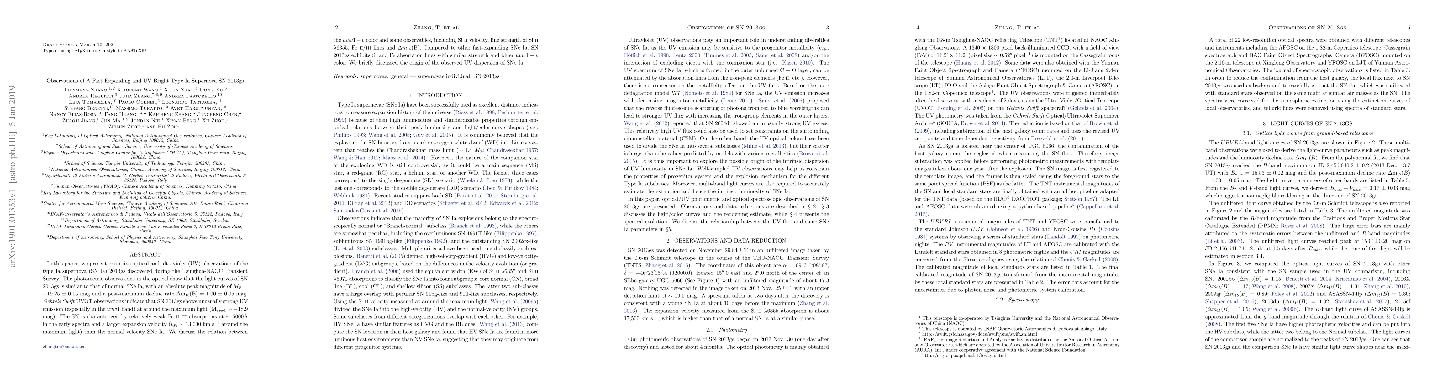 In this paper, we present extensive optical and ultraviolet (UV) observations of the type Ia supernova (SN Ia) 2013gs discovered during the Tsinghua-NAOC Transient Survey. The photometric observations in the optical show that the light curves of SN 2013gs is similar to that of normal SNe Ia, with an absolute peak magnitude of $M_{B}$ = $-$19.25 $\pm$ 0.15 mag and a post-maximum decline rate $\Delta$m$_{15}$(B) = 1.00 $ \pm $ 0.05 mag. \emph{Gehrels Swift} UVOT observations indicate that SN 2013gs shows unusually strong UV emission (especially in the $uvw1$ band) at around the maximum light (M$_{uvw1}$ $\sim$ $-$18.9 mag). The SN is characterized by relatively weak Fe~{\sc ii} {\sc iii} absorptions at $\sim$ 5000{\AA} in the early spectra and a larger expansion velocity ($v_{Si}$ $\sim$ 13,000 km s$^{-1}$ around the maximum light) than the normal-velocity SNe Ia. We discuss the relation between the $uvw1-v$ color and some observables, including Si~{\sc ii} velocity, line strength of Si~{\sc ii} $\lambda$6355, Fe~{\sc ii}/{\sc iii} lines and $\Delta m_{15}$(B). Compared to other fast-expanding SNe Ia, SN 2013gs exhibits Si and Fe absorption lines with similar strength and bluer $uvw1-v$ color. We briefly discussed the origin of the observed UV dispersion of SNe Ia.