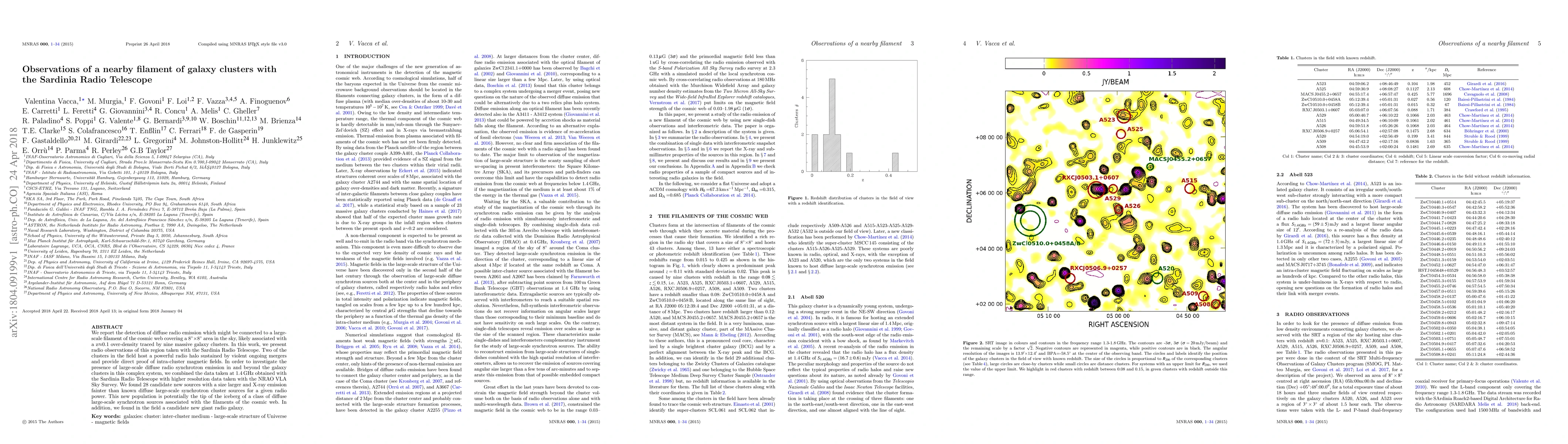 This study uses the Sardinia Radio Telescope to detect diffuse radio emission linked to a cosmic web filament, revealing new sources and evidence of intra-cluster magnetic fields in galaxy clusters. The findings suggest a new population of diffuse large-scale synchrotron sources associated with cosmic web filaments.