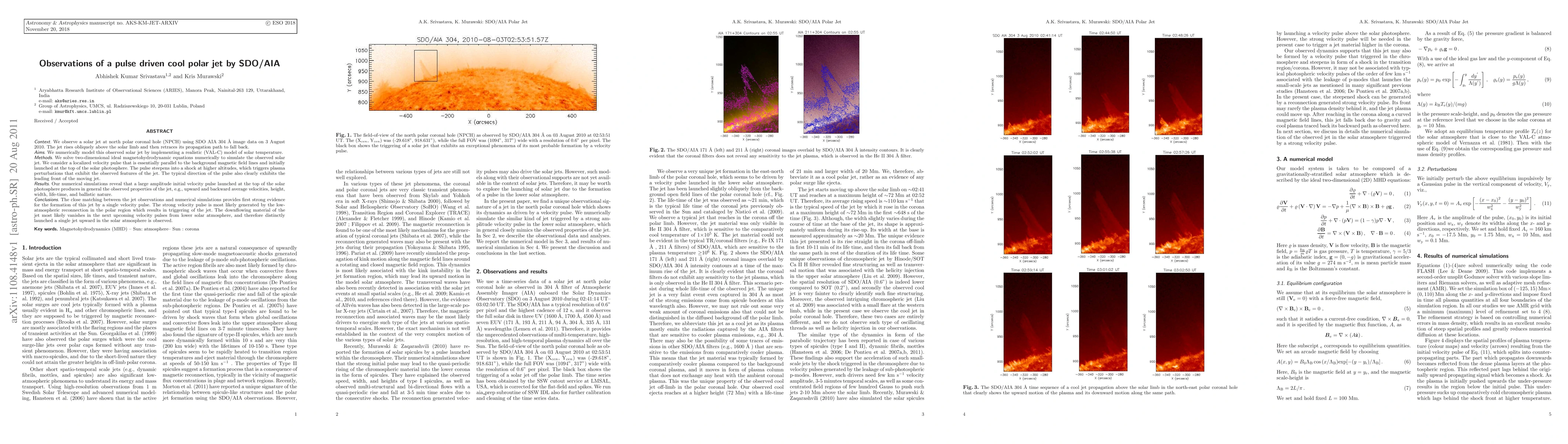 This study observes and models a pulse-driven cool polar jet at the north polar coronal hole using SDO/AIA data. Numerical simulations of ideal magnetohydrodynamics show that a large amplitude velocity pulse from low atmospheric reconnection generates the observed jet properties, providing evidence for its formation by a single pulse.