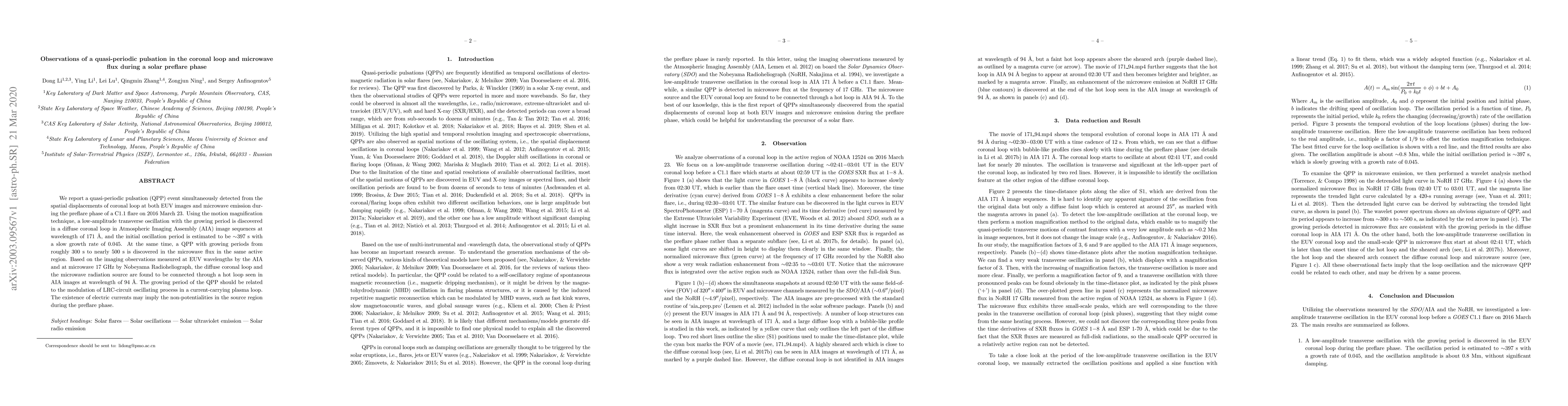 We report a quasi-periodic pulsation (QPP) event simultaneously detected from the spatial displacements of coronal loop at both EUV images and microwave emission during the preflare phase of a C1.1 flare on 2016 March 23. Using the motion magnification technique, a low-amplitude transverse oscillation with the growing period is discovered in a diffuse coronal loop in Atmospheric Imaging Assembly (AIA) image sequences at wavelength of 171 A, and the initial oscillation period is estimated to be ~397 s with a slow growth rate of 0.045. At the same time, a QPP with growing periods from roughly 300 s to nearly 500 s is discovered in the microwave flux in the same active region. Based on the imaging observations measured at EUV wavelengths by the AIA and at microwave 17 GHz by Nobeyama Radioheliograph, the diffuse coronal loop and the microwave radiation source are found to be connected through a hot loop seen in AIA images at wavelength of 94 A. The growing period of the QPP should be related to the modulation of LRC-circuit oscillating process in a current-carrying plasma loop. The existence of electric currents may imply the non-potentialities in the source region during the preflare phase.