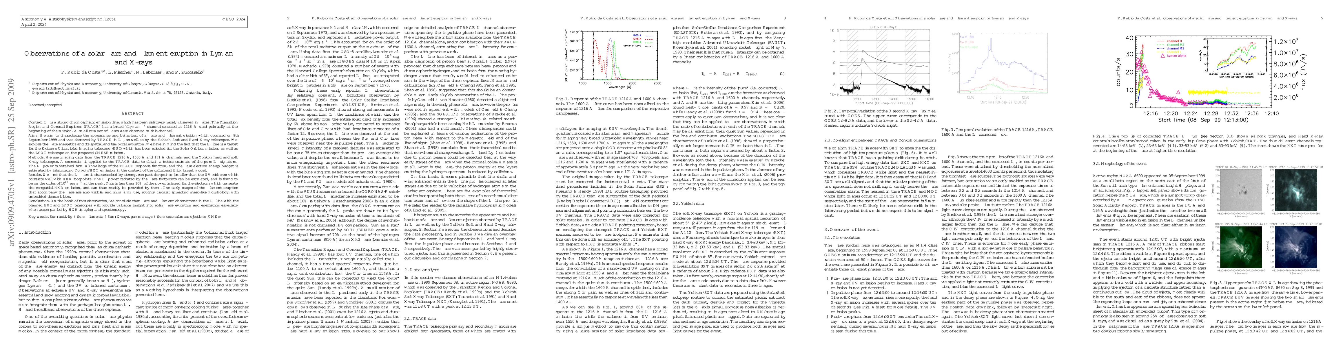 We aim to characterise the appearance and behaviour of a flare and filament ejection which occurred on 8th September 1999 and was observed by TRACE in L-alpha as well as by the Yohkoh Soft and Hard X-ray telescopes. We explore the flare energetics and its spatial and temporal evolution. A correction is applied to the TRACE data to obtain a better estimate of the pure L-alpha signature. The L-alpha power is obtained from a knowledge of the TRACE response function, and the flare electron energy budget is estimated by interpreting Yohkoh/HXT emission in the context of the collisional thick target model.