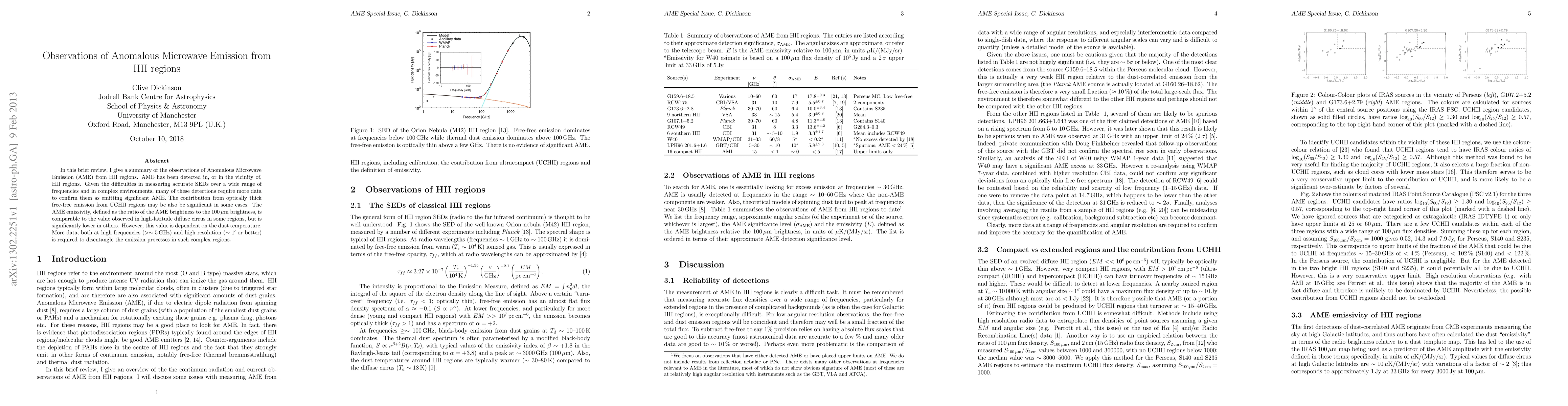 This paper reviews observations of Anomalous Microwave Emission (AME) from HII regions, noting that while AME has been detected in these areas, more data is needed to confirm its significance. The AME emissivity varies with dust temperature and requires high-frequency and high-resolution data to fully understand its emission processes.