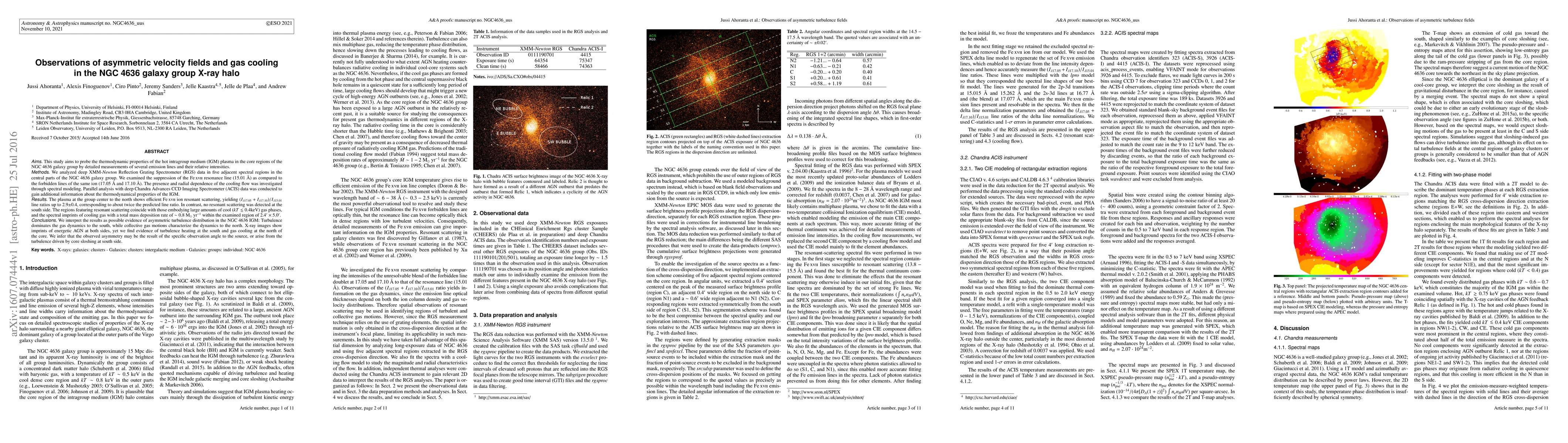 This study aims to probe the thermodynamic properties of the hot intragroup medium (IGM) plasma in the core regions of the NGC 4636 galaxy group by detailed measurements of several emission lines and their relative intensities. We analyzed deep XMM-Newton Reflection Grating Spectrometer (RGS) data in five adjacent spectral regions in the central parts of the NGC 4636 galaxy group. We examined the suppression of the Fe xvii resonance line (15.01 {\AA}) as compared to the forbidden lines of the same ion (17.05 {\AA} and 17.10 {\AA}). The presence and radial dependence of the cooling flow was investigated through spectral modeling. In addition, a parallel analysis with deep Chandra Advances CCD Imaging Spectrometer (ACIS) data was conducted to gain additional information about the thermodynamical properties of the IGM. We find that the plasma at the group center to the north shows efficient Fe xvii ion resonant scattering, wheras no resonant scattering was detected at the south side. The regions featuring resonant scattering coincide with those embodying large amounts of cool ($kT\lesssim0.4$ keV) gas phases, and the spectral imprints of cooling gas with a total mass deposition rate of $\sim0.8$ M$_{\odot}$ yr$^{-1}$ within the examined region of $2.4^{\prime}\times 5.0^{\prime}$. We interpret the results as possible evidence of asymmetric turbulence distribution in the NGC 4636 IGM: Turbulence dominates the gas dynamics to the south, while collective gas motions characterize the dynamics to the north. X-ray images show imprints of energetic AGN at both sides, yet we find evidence of turbulence heating at the south and gas cooling at the north of the core. We infer that the observed asymmetry may be the result of the specific observation angle to the source, or arise from the turbulence driven by core sloshing at south side.