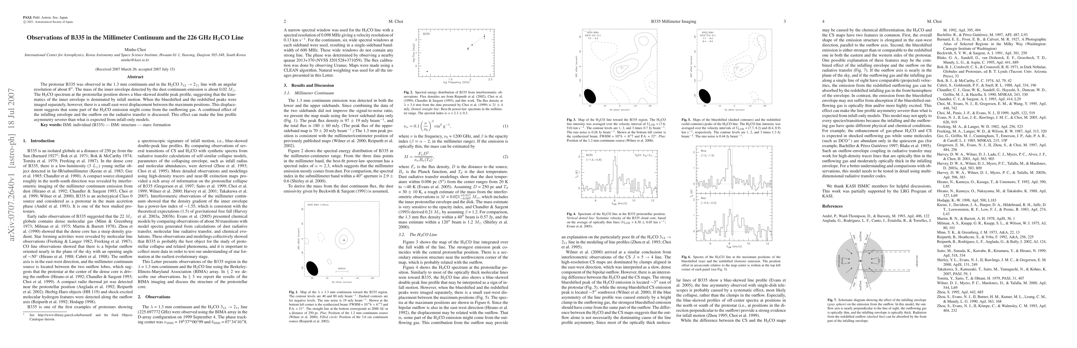 The protostar B335 was observed in the 1.3 mm continuum and in the H2CO 312 - 211 line with an angular resolution of about 8 arcsec. The mass of the inner envelope detected by the dust continuum emission is about 0.02 Msun. The H2CO spectrum at the protostellar position shows a blue-skewed double peak profile, suggesting that the kinematics of the inner envelope is dominated by infall motion. When the blueshifted and the redshifted peaks were imaged separately, however, there is a small east-west displacement between the maximum positions. This displacement suggests that some part of the H2CO emission might come from the outflowing gas. A combined effect of the infalling envelope and the outflow on the radiative transfer is discussed. This effect can make the line profile asymmetry severer than what is expected from infall-only models.