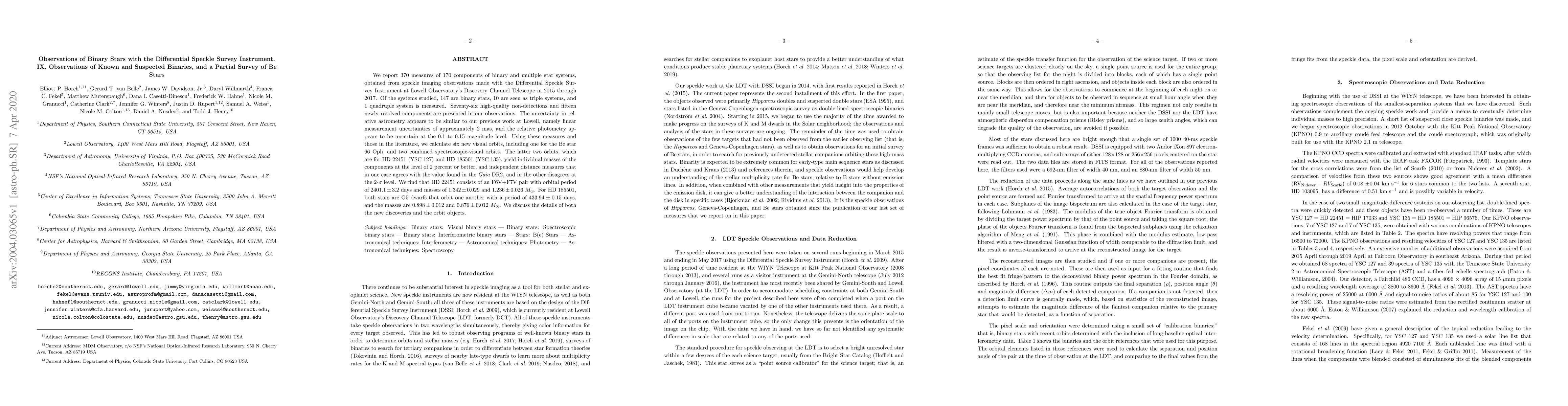 We report 370 measures of 170 components of binary and multiple star systems, obtained from speckle imaging observations made with the Differential Speckle Survey Instrument at Lowell Observatory's Discovery Channel Telescope in 2015 through 2017. Of the systems studied, 147 are binary stars, 10 are seen as triple systems, and 1 quadruple system is measured. Seventy-six high-quality non-detections and fifteen newly resolved components are presented in our observations. The uncertainty in relative astrometry appears to be similar to our previous work at Lowell, namely linear measurement uncertainties of approximately 2 mas, and the relative photometry appears to be uncertain at the 0.1 to 0.15 magnitude level. Using these measures and those in the literature, we calculate six new visual orbits, including one for the Be star 66 Oph, and two combined spectroscopic-visual orbits. The latter two orbits, which are for HD 22451 (YSC 127) and HD 185501 (YSC 135), yield individual masses of the components at the level of 2 percent or better, and independent distance measures that in one case agrees with the value found in the Gaia DR2, and in the other disagrees at the 2-$\sigma$ level. We find that HD 22451 consists of an F6V+F7V pair with orbital period of $2401.1 \pm 3.2$ days and masses of $1.342 \pm 0.029$ and $1.236 \pm 0.026$ $ M_{\odot}$. For HD 185501, both stars are G5 dwarfs that orbit one another with a period of $433.94 \pm 0.15$ days, and the masses are $0.898 \pm 0.012$ and $0.876 \pm 0.012$ $ M_{\odot}$. We discuss the details of both the new discoveries and the orbit objects.