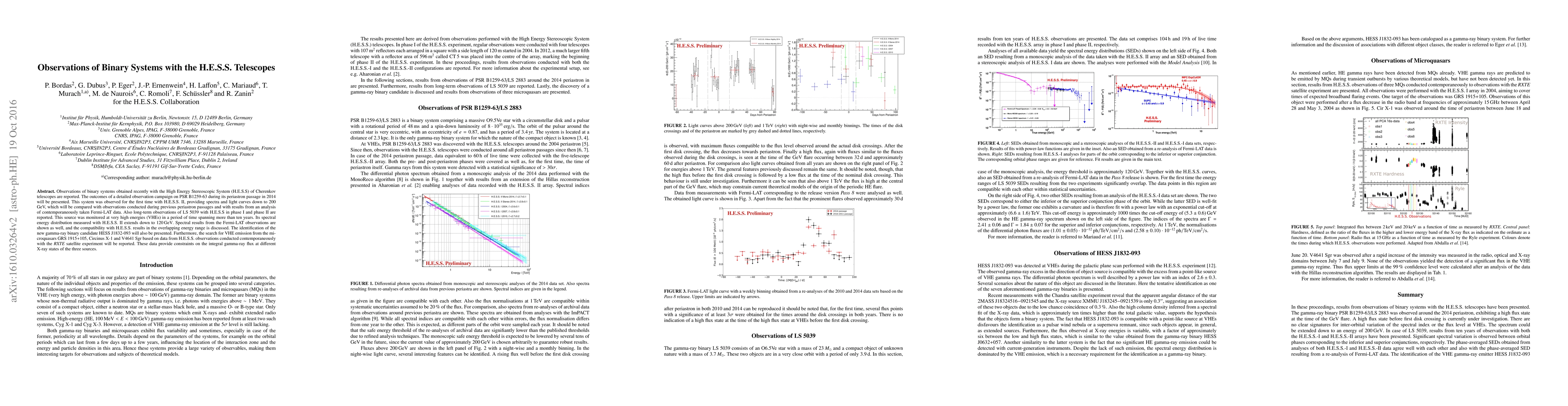 Observations of binary systems obtained recently with the High Energy Stereoscopic System (H.E.S.S) of Cherenkov telescopes are reported. The outcomes of a detailed observation campaign on PSR B1259-63 during its periastron passage in 2014 will be presented. This system was observed for the first time with H.E.S.S. II, providing spectra and light curves down to 200 GeV, which will be compared with observations conducted during previous periastron passages and with results from an analysis of contemporaneously taken Fermi-LAT data. Also long-term observations of LS 5039 with H.E.S.S in phase I and phase II are reported. This source was monitored at very high energies (VHEs) in a period of time spanning more than ten years. Its spectral energy distribution measured with H.E.S.S. II extends down to 120 GeV. Spectral results from the Fermi-LAT observations are shown as well, and the compatibility with H.E.S.S. results in the overlapping energy range is discussed. The identification of the new gamma-ray binary candidate HESS J1832-093 will also be presented. Furthermore, the search for VHE emission from the microquasars GRS 1915+105, Circinus X-1 and V4641 Sgr based on data from H.E.S.S. observations conducted contemporaneously with the RXTE satellite experiment will be reported. These data provide constraints on the integral gamma-ray flux at different X-ray states of the three sources.