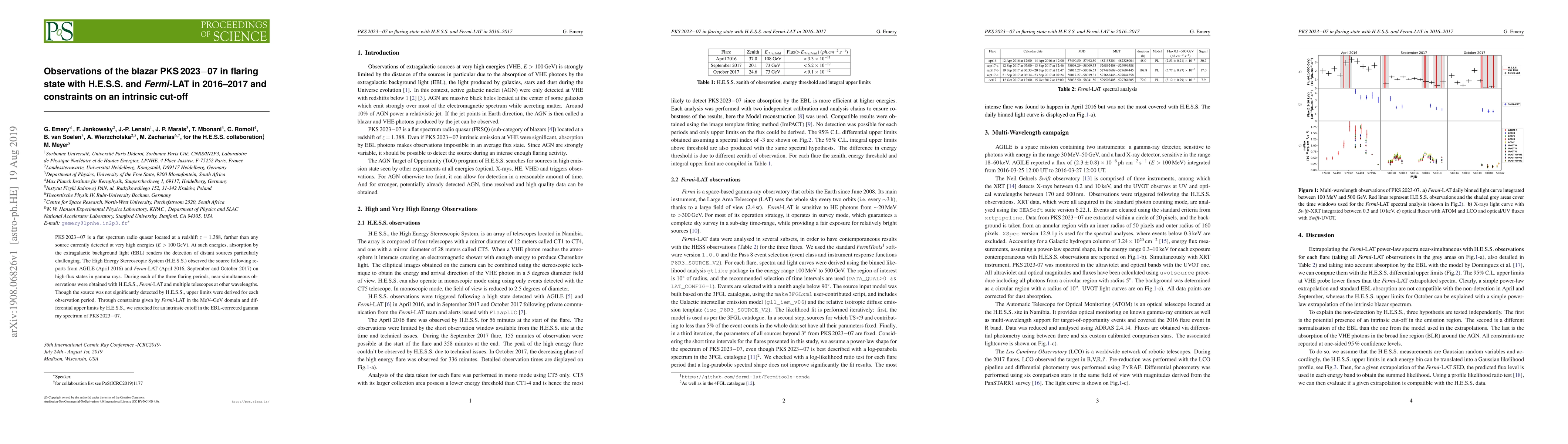 PKS 2023-07 is a flat spectrum radio quasar located at a redshift $z=1.388$, farther than any source currently detected at very high energies ($E>100$ GeV). At such energies, absorption by the extragalactic background light (EBL) renders the detection of distant sources particularly challenging. The High Energy Stereoscopic System (H.E.S.S.) observed the source following reports from AGILE (April 2016) and Fermi-LAT (April 2016, September and October 2017) on high-flux states in gamma rays. During each of the three flaring periods, near-simultaneous observations were obtained with H.E.S.S., Fermi-LAT and multiple telescopes at other wavelengths. Though the source was not significantly detected by H.E.S.S., upper limits were derived for each observation period. Through constraints given by Fermi-LAT in the MeV--GeV domain and differential upper limits by H.E.S.S., we searched for an intrinsic cutoff in the EBL-corrected gamma ray spectrum of PKS 2023-07.