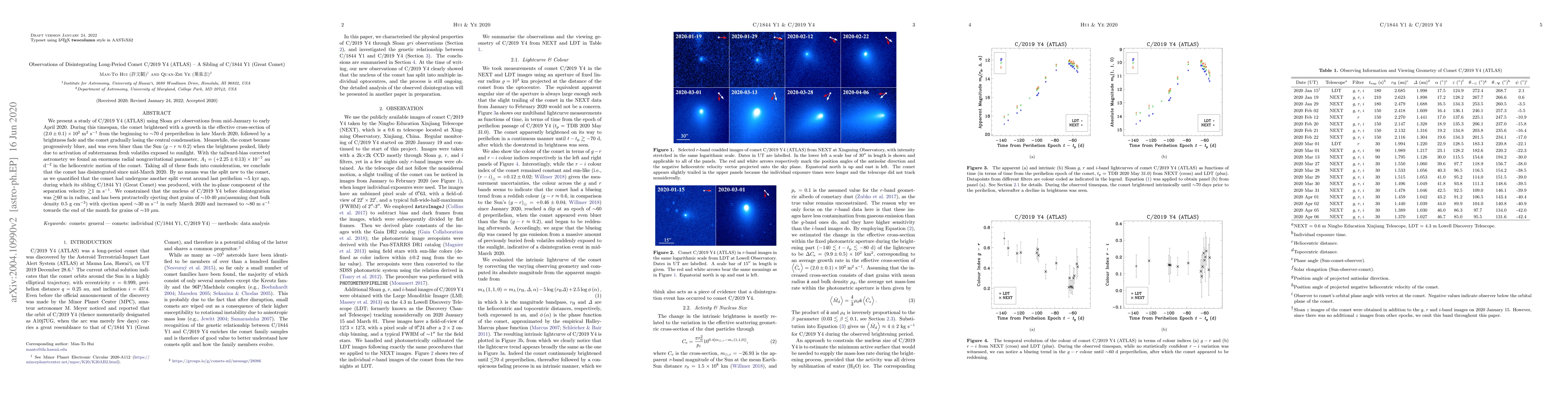 This study observes the disintegration of long-period comet C/2019 Y4 (ATLAS) using Sloan $gri$ observations from mid-January to early April 2020, revealing a significant increase in brightness and cross-section followed by a fade and loss of central condensation, indicative of disintegration. The comet's sibling, C/1844 Y1 (Great Comet), was formed in a similar split event around 5,000 years ago.