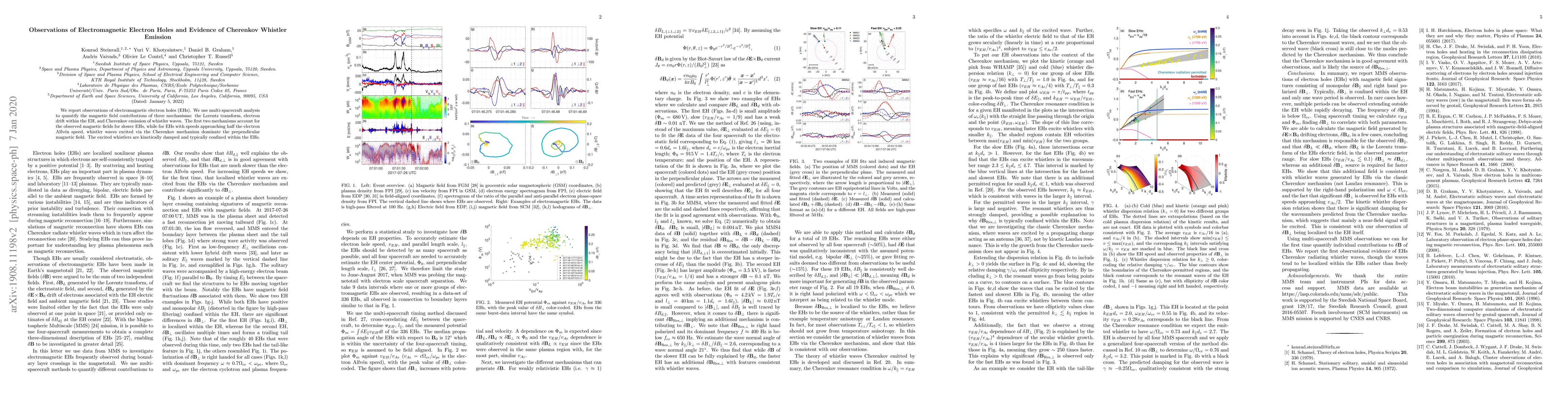 We report observations of electromagnetic electron holes (EHs). We use multi-spacecraft analysis to quantify the magnetic field contributions of three mechanisms: the Lorentz transform, electron drift within the EH, and Cherenkov emission of whistler waves. The first two mechanisms account for the observed magnetic fields for slower EHs, while for EHs with speeds approaching half the electron Alfv\'en speed, whistler waves excited via the Cherenkov mechanism dominate the perpendicular magnetic field. The excited whistlers are kinetically damped and typically confined within the EHs.