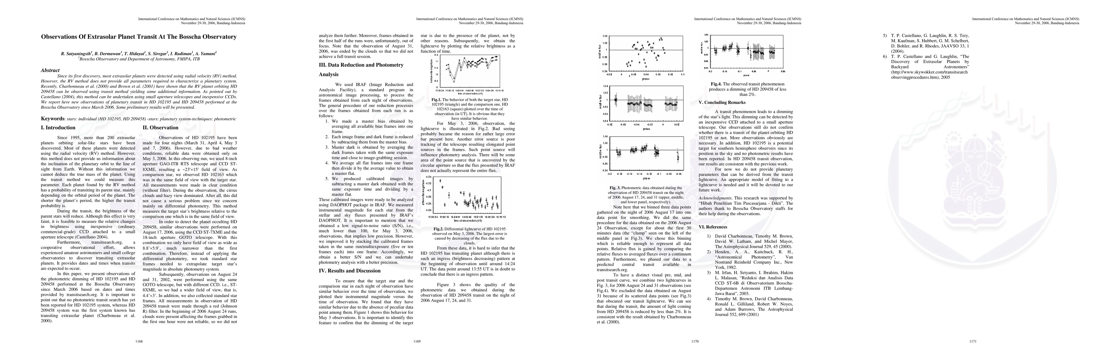Since its first discovery, most extrasolar planets were detected using radial velocity (RV) method. However, the RV method does not provide all parameters required to characterize a planetary system. Recently, Charbonneau et al.(2000) and Brown et al(2001)have shown that the RV planet orbiting HD 209458 can be observed using transit method yielding some additional information. As pointed out by Castellano (2004), this method can be undertaken using small aperture telescopes and inexpensive CCDs. We report here new observations of planetary transit in HD 102195 and HD 209458 performed at the Bosscha Observatory since March 2006. Some preliminary results will be presented