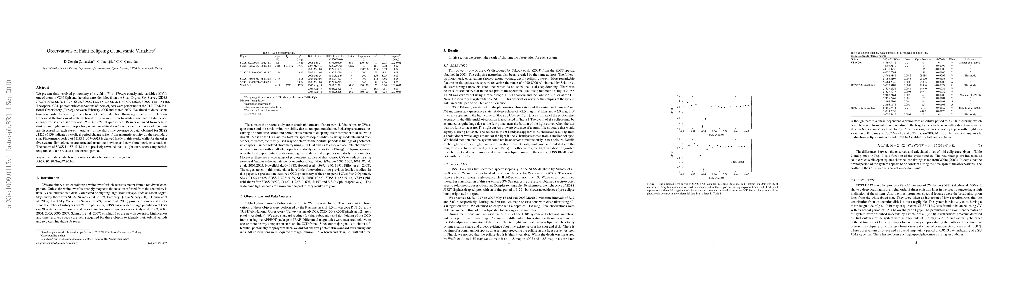 We present time-resolved photometry of six faint (V>17mag) cataclysmic variables (CVs); one of them is V849 Oph and the others are identified from the Sloan Digital Sky Survey (SDSS J0920+0042, SDSS J1327+6528, SDSS J1227+5139, SDSS J1607.02+3623, SDSS J1457+5148). The optical CCD photometric observations of these objects were performed at the T\"UB\.ITAK National Observatory (Turkey) between February 2006 and March 2009. We aimed to detect short time scale orbital variability arisen from hot-spot modulation, flickering structures which occur from rapid fluctuations of material transferring from red star to white dwarf and orbital period changes for selected short-period (P<4h) CVs at quiescence. Results obtained from eclipse timings and light curves morphology related to white dwarf stars, accretion disks and hot-spots are discussed for each system. Analysis of the short time coverage of data, obtained for SDSS J1227+5139 indicates a cyclical period change arisen from magnetic activity on the secondary star. Photometric period of SDSS J1607+3623 is derived firstly in this study, while for the other five systems light elements are corrected using the previous and new photometric observations. The nature of SDSS J1457+5148 is not precisely revealed that its light curve shows any periodicity that could be related to the orbital period.