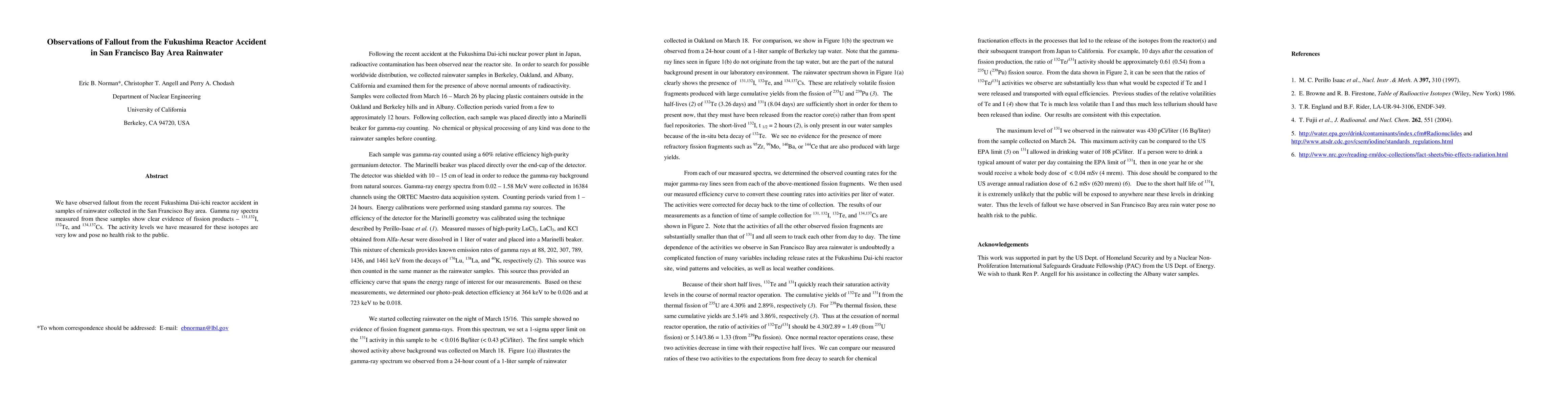 Summary: This study detected low levels of Fukushima reactor accident fallout in San Francisco Bay rainwater, identified by gamma ray spectra showing fission products including iodine and cesium isotopes, which pose no health risk.