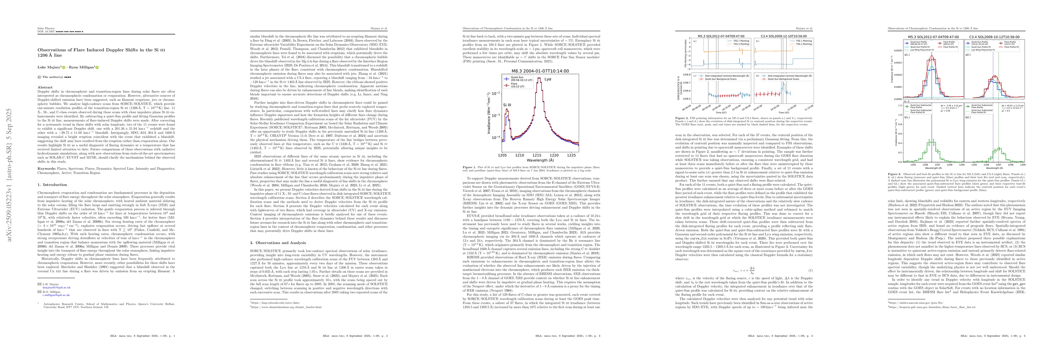 Doppler shifts in chromospheric and transition-region lines during solar flares are often interpreted as chromospheric condensation or evaporation. However, alternative sources of Doppler-shifted emission have been suggested, such as filament eruptions, jets or chromospheric bubbles. We analyse high-cadence scans from SORCE/SOLSTICE, which provide one-minute resolution profiles of the transition-region Si~\textsc{iii} ($1206\,\textrm{{\AA}}$, $\textrm{T} = 10^{4.6}\,\textrm{K}$) line. 11 X-, M-, and C-class events observed during these scans with clear impulsive phase Si~\textsc{iii} enhancements were identified. By subtracting a quiet-Sun profile and fitting Gaussian profiles to the Si~\textsc{iii} line, measurements of flare-induced Doppler shifts were made. After correcting for a systematic trend in these shifts with solar longitude, two of the 11 events were found to exhibit a significant Doppler shift, \comment{}one with a $201.36\pm21.94\;\textrm{km\,s}^{-1}$ redshift and the other with a $-39.75\pm11.00\;\textrm{km\,s}^{-1}$ blueshift\commentend{}. Intriguingly, SDO/AIA $304\,\textrm{{\AA}}$ and $1600\,\textrm{{\AA}}$ imaging revealed a bright eruption coincident with the event that exhibited a blueshift, suggesting the shift may have resulted from the eruption rather than evaporation alone. Our results highlight Si~\textsc{iii} as a useful diagnostic of flaring dynamics at a temperature that has received limited attention to date. Future comparisons of these observations with radiative hydrodynamic simulations, along with new observations from state-of-the-art spectrometers such as SOLAR-C/EUVST and MUSE, should clarify the mechanisms behind the observed shifts in this study.