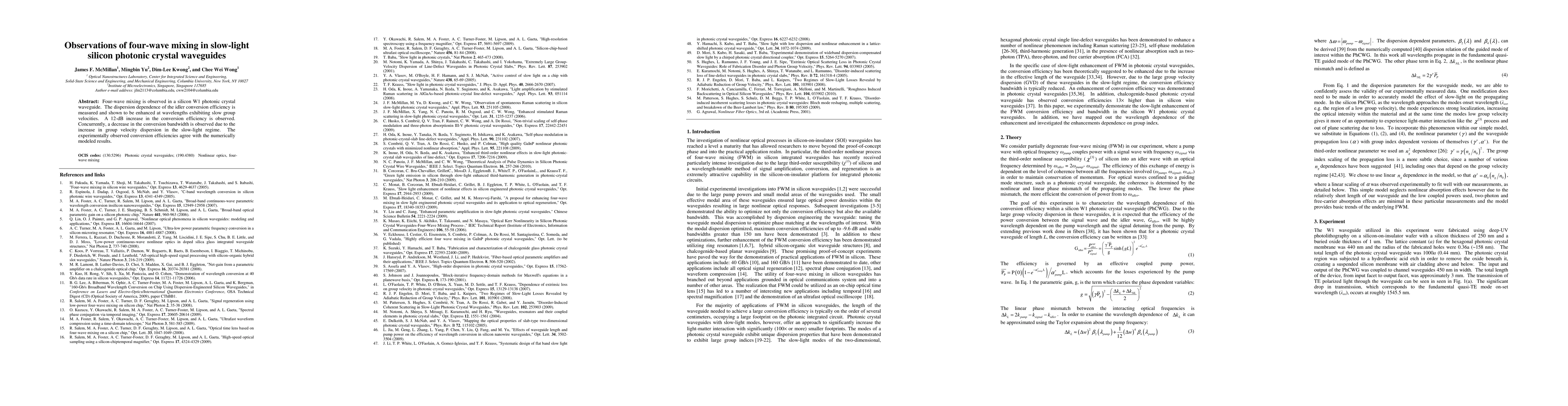 Summary: This research observes enhanced four-wave mixing in slow-light silicon photonic crystal waveguides, showing a 12-dB increase in idler conversion efficiency at wavelengths with slow group velocities. However, the conversion bandwidth decreases due to increased group velocity dispersion in the slow-light regime, with experimental results matching numerical models.