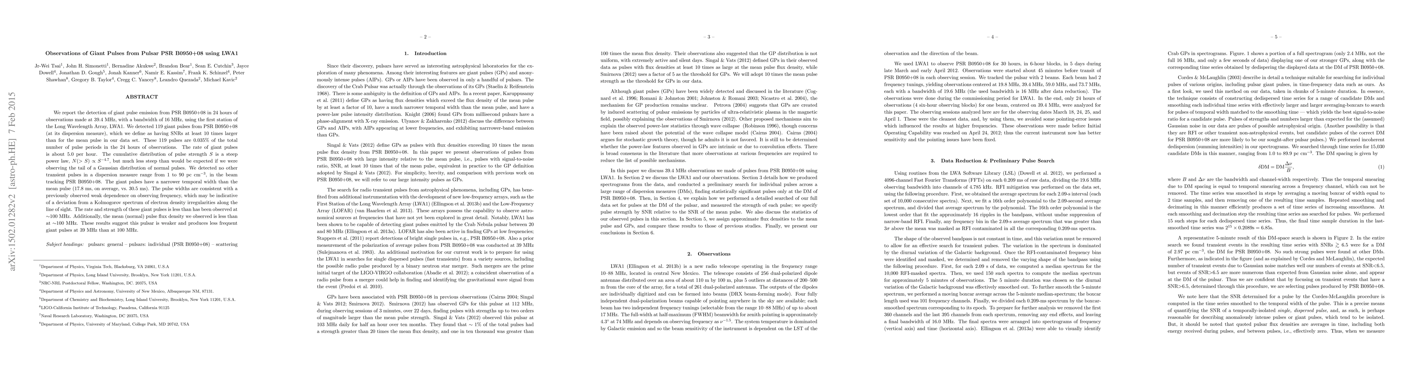 This study detected 119 giant pulses from pulsar PSR B0950+08 using LWA1 at 39.4 MHz, showing a steep power-law distribution and a narrower temporal width than normal pulses. The findings suggest PSR B0950+08 produces fewer and weaker giant pulses at 39 MHz compared to higher frequencies.