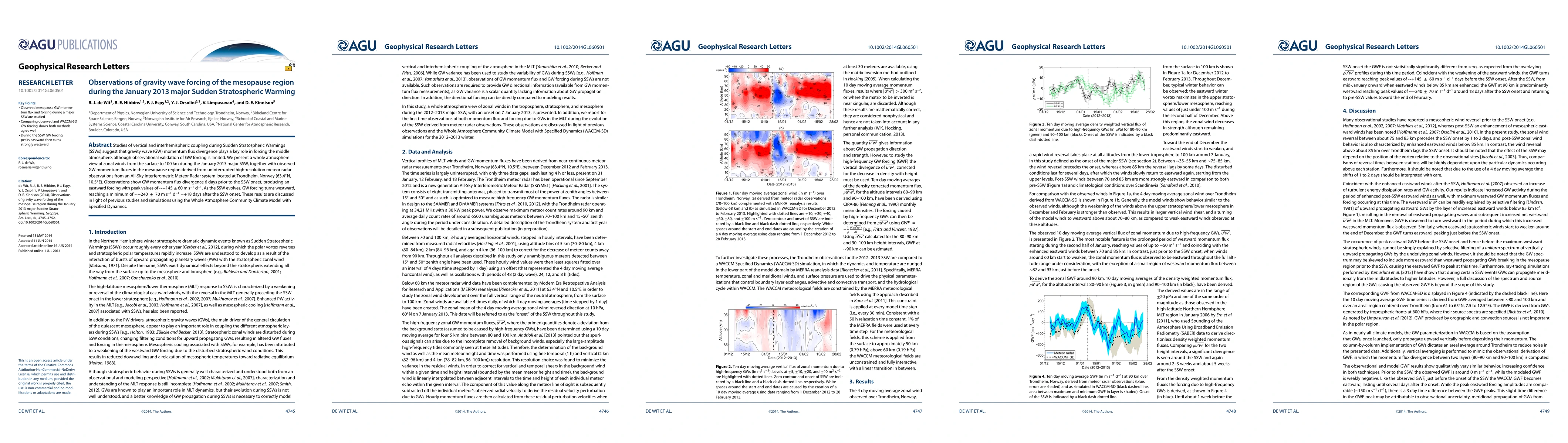 Research shows that gravity waves played a key role in forcing the mesosphere during a 2013 Sudden Stratospheric Warming event, with eastward and then westward momentum flux divergence observed over time.