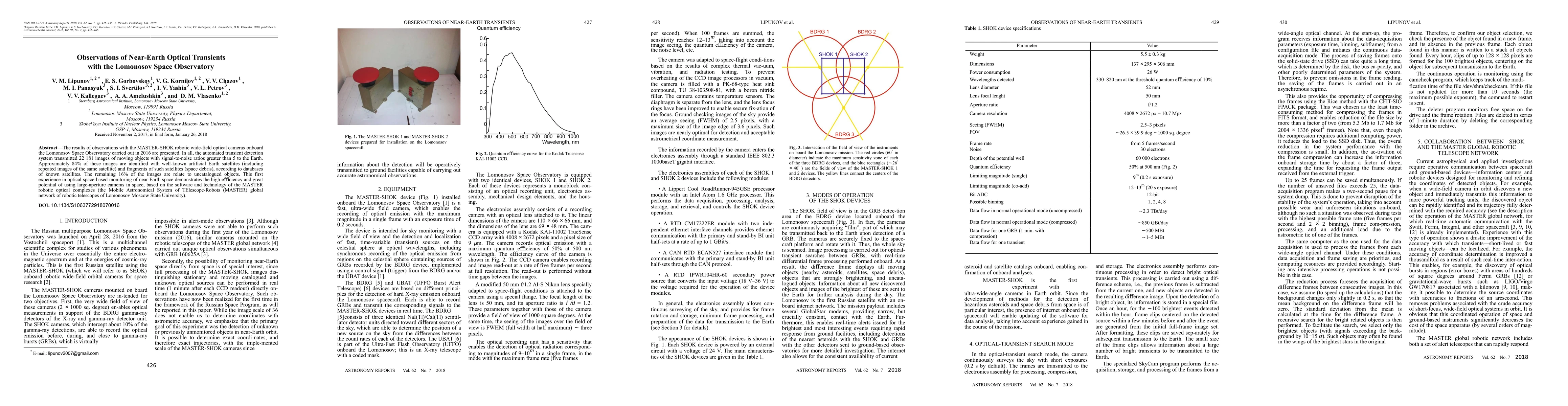 The results of observations with the MASTER-SHOK robotic wide-field optical cameras onboard the Lomonosov Space Observatory carried out in 2016 are presented. In all, the automated transient detection system transmitted 22 181 images of moving objects with signal-to-noise ratios greater than 5 to the Earth. Approximately 84% of these images are identified with well-known artificial Earth satellites (including repeated images of the same satellite) and fragments of such satellites (space debris), according to databases of known satellites. The remaining 16% of the images are relate to uncatalogued objects. This first experience in optical space-based monitoring of near-Earth space demonstrates the high efficiency and great potential of using large-aperture cameras in space, based on the software and technology of the MASTER robotic optical complexes (the Mobile Astronomical System of TElescope-Robots (MASTER) global network of robotic telescopes of Lomonosov Moscow State University).