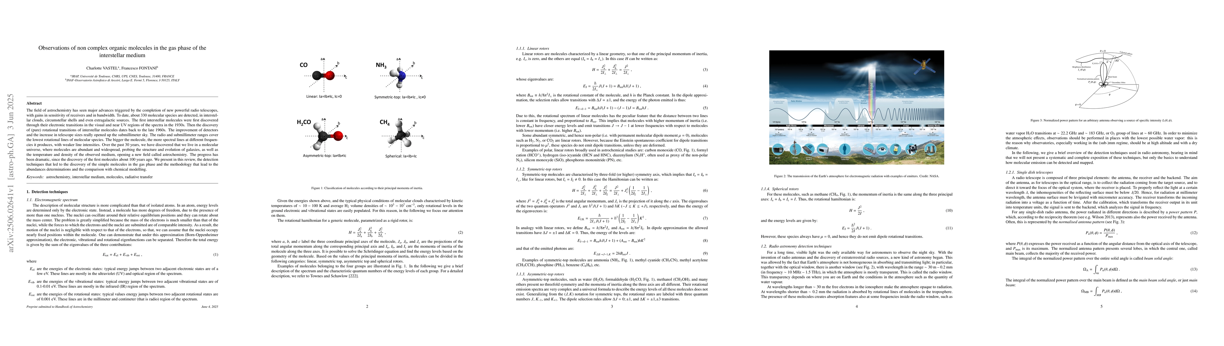 The field of astrochemistry has seen major advances triggered by the completion of new powerful radio telescopes, with gains in sensitivity of receivers and in bandwidth. To date, about 330 molecular species are detected, in interstellar clouds, circumstellar shells and even extragalactic sources. The first interstellar molecules were first discovered through their electronic transitions in the visual and near UV regions of the spectra in the 1930s. Then the discovery of (pure) rotational transitions of interstellar molecules dates back to the late 1960s. The improvement of detectors and the increase in telescope sizes really opened up the submillimeter sky. The radio and submillimeter ranges cover the lowest rotational lines of molecular species. The bigger the molecule, the more spectral lines at different frequencies it produces, with weaker line intensities. Over the past 30 years, we have discovered that we live in a molecular universe, where molecules are abundant and widespread, probing the structure and evolution of galaxies, as well as the temperature and density of the observed medium, opening a new field called astrochemistry. The progress has been dramatic, since the discovery of the first molecules about 100 years ago. We present in this review, the detection techniques that led to the discovery of the simple molecules in the gas phase and the methodology that lead to the abundances determinations and the comparison with chemical modelling.