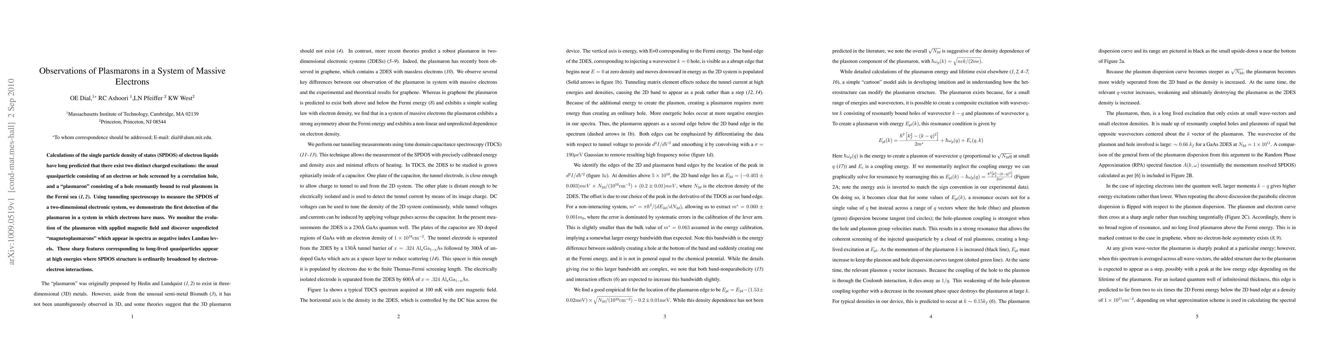 Calculations of the single particle density of states (SPDOS) of electron liquids have long predicted that there exist two distinct charged excitations: the usual quasiparticle consisting of an electron or hole screened by a correlation hole, and a "plasmaron" consisting of a hole resonantly bound to real plasmons in the Fermi sea(1,2). Using tunneling spectroscopy to measure the SPDOS of a two-dimensional electronic system, we demonstrate the first detection of the plasmaron in a system in which electrons have mass. We monitor the evolution of the plasmaron with applied magnetic field and discover unpredicted "magnetoplasmarons" which appear in spectra as negative index Landau levels. These sharp features corresponding to long-lived quasiparticles appear at high energies where SPDOS structure is ordinarily broadened by electron-electron interactions.