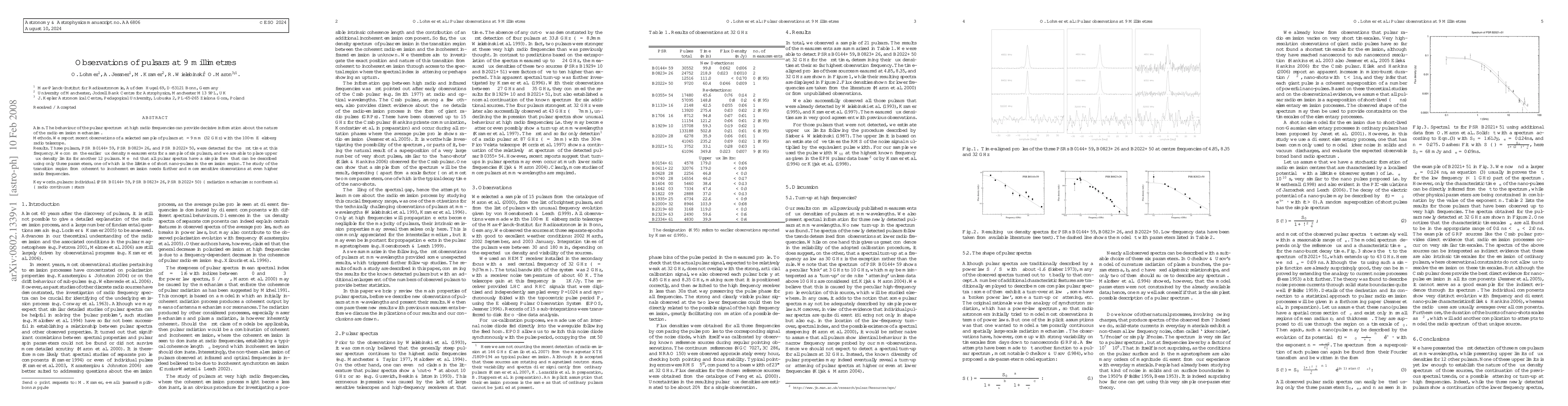 The behaviour of the pulsar spectrum at high radio frequencies can provide decisive information about the nature of the radio emission mechanism. We report recent observations of a selected sample of pulsars at lambda=9mm (32 GHz) with the 100-m Effelsberg radio telescope.Three pulsars, PSR B0144+59, PSR B0823+26, and PSR B2022+50, were detected for the first time at this frequency. We confirm the earlier flux density measurements for a sample of six pulsars, and we are able to place upper flux density limits for another 12 pulsars. We find that all pulsar spectra have a simple form that can be described using only three parameters, one of which is the lifetime of short nano-pulses in the emission region.The study of the transition region from coherent to incoherent emission needs further and more sensitive observations at even higher radio frequencies.