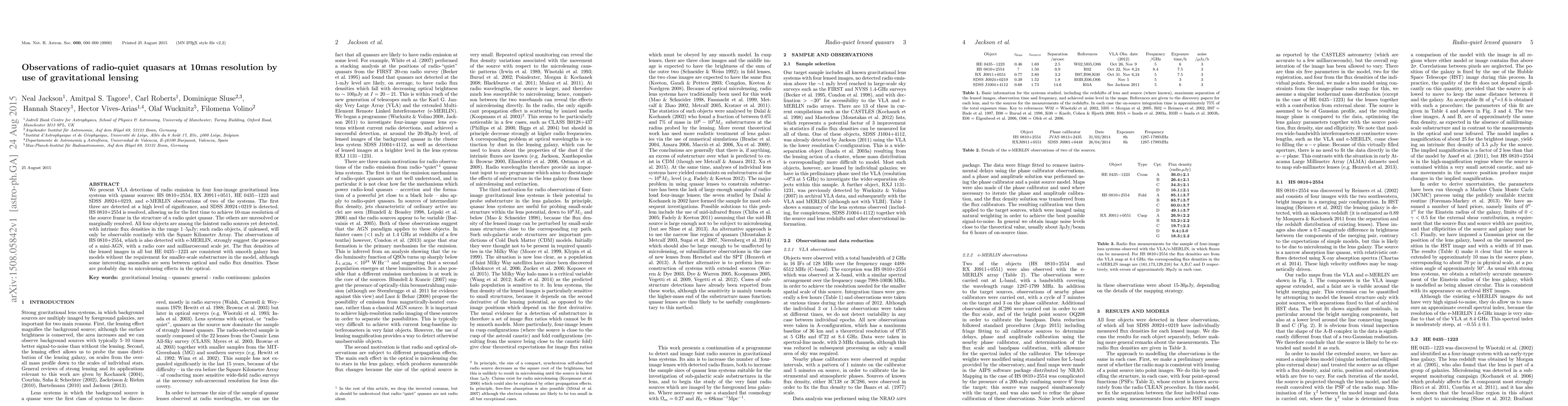 This paper reports VLA and e-MERLIN detections of radio emissions in four gravitational lens systems with quasars, revealing that even radio-quiet quasars can host mini-AGN. HS0810+2554, resolved at 10-mas resolution, provides evidence for a radio core and jet, while the others remain unresolved or marginally resolved.