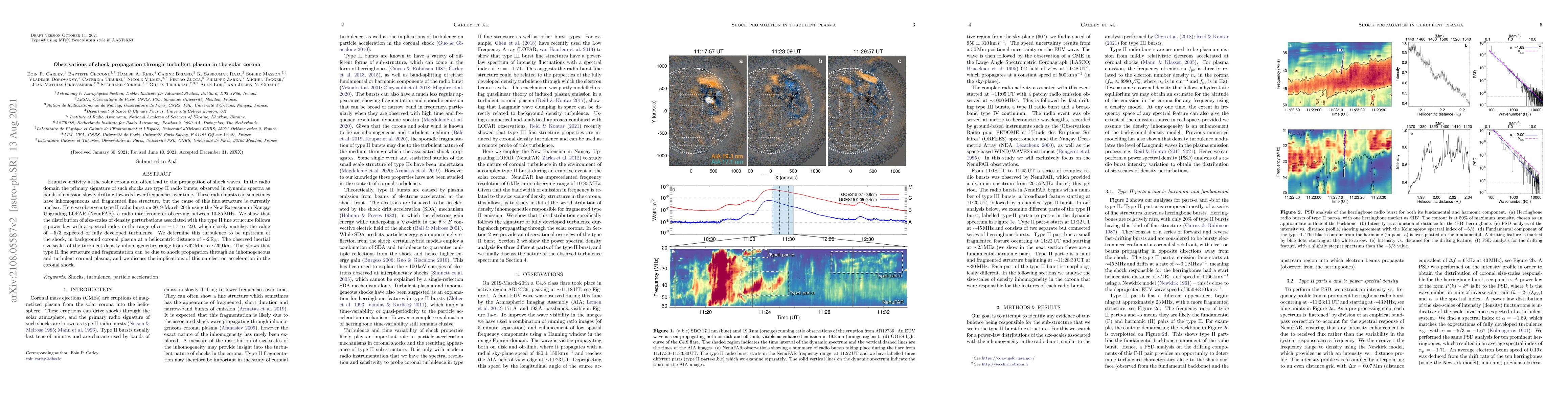 Eruptive activity in the solar corona can often lead to the propagation of shock waves. In the radio domain the primary signature of such shocks are type II radio bursts, observed in dynamic spectra as bands of emission slowly drifting towards lower frequencies over time. These radio bursts can sometimes have inhomogeneous and fragmented fine structure, but the cause of this fine structure is currently unclear. Here we observe a type II radio burst on 2019-March-20th using the New Extension in Nan\c{c}ay Upgrading LOFAR (NenuFAR), a radio interferometer observing between 10-85 MHz. We show that the distribution of size-scales of density perturbations associated with the type II fine structure follows a power law with a spectral index in the range of $\alpha=-1.7$ to -2.0, which closely matches the value of $-5/3$ expected of fully developed turbulence. We determine this turbulence to be upstream of the shock, in background coronal plasma at a heliocentric distance of $\sim$2 R$_{\odot}$. The observed inertial size-scales of the turbulent density inhomogeneities range from $\sim$62 Mm to $\sim$209 km. This shows that type II fine structure and fragmentation can be due to shock propagation through an inhomogeneous and turbulent coronal plasma, and we discuss the implications of this on electron acceleration in the coronal shock.