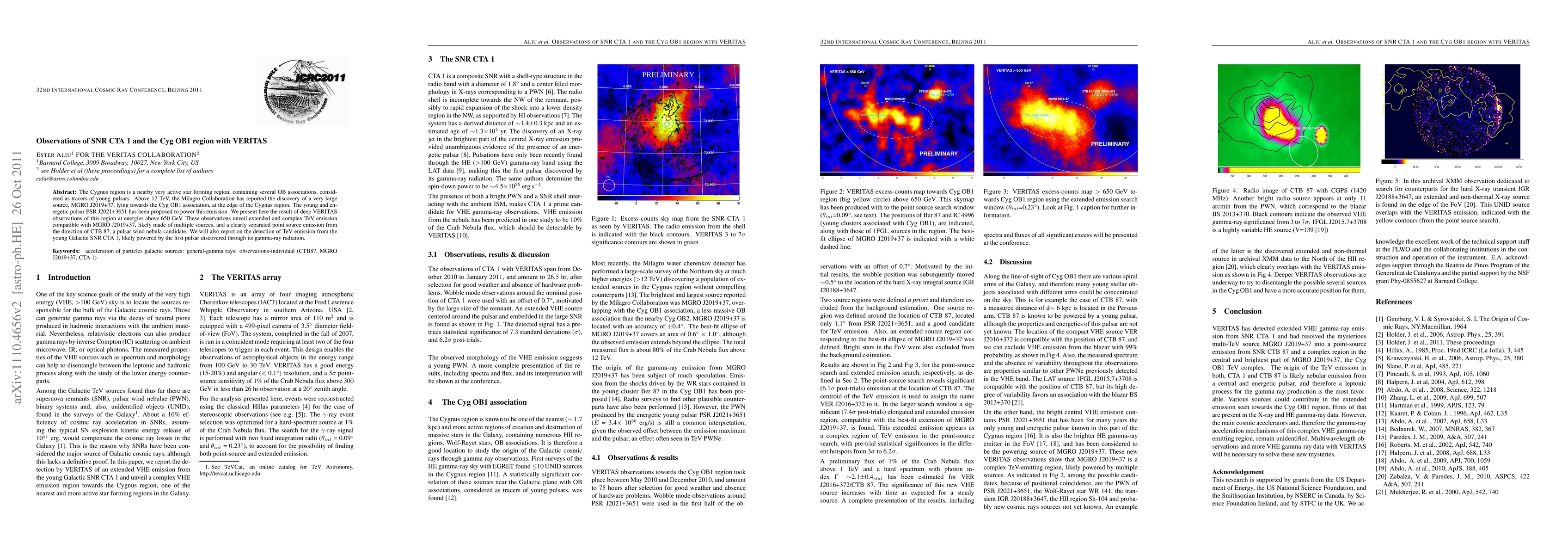VERITAS observations reveal extended and complex TeV emission in the Cyg OB1 region, likely comprising multiple sources, alongside a distinct point source from CTB 87, a pulsar wind nebula candidate, and TeV emission from SNR CTA 1, possibly powered by its first discovered pulsar.