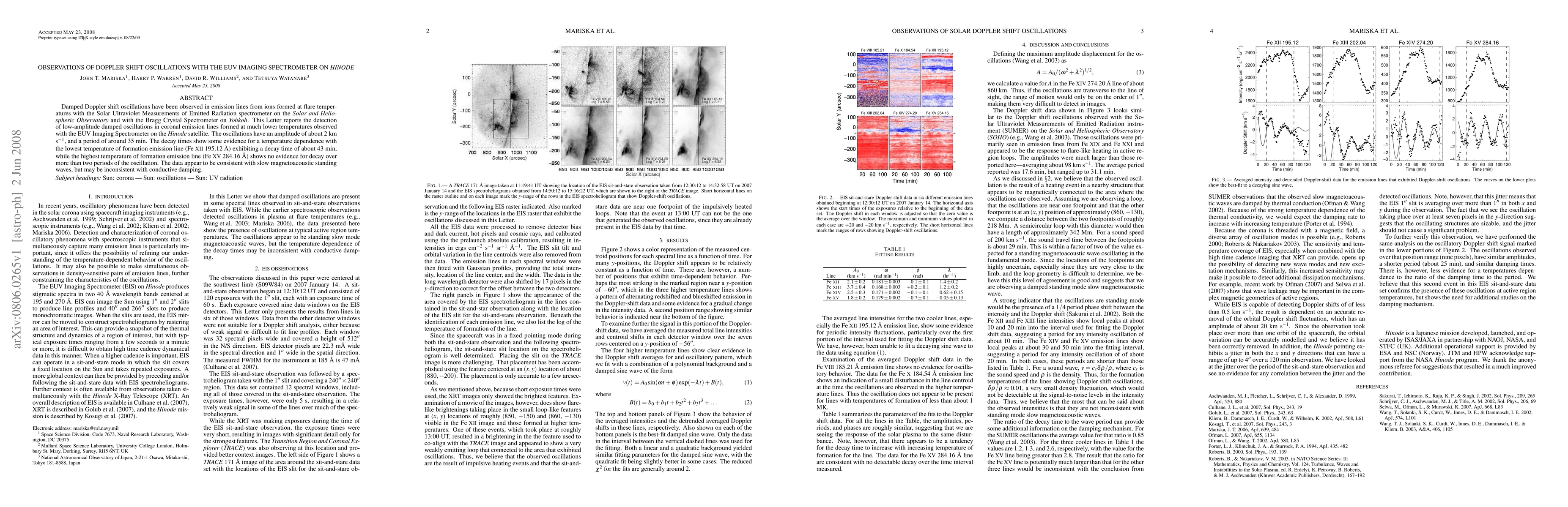 This paper reports the detection of low-amplitude, damped oscillations in coronal emission lines using the EUV Imaging Spectrometer on Hinode, with periods around 35 min and amplitudes of 2 km/s. The decay times suggest a temperature dependence, with lower temperature lines showing longer decay times.