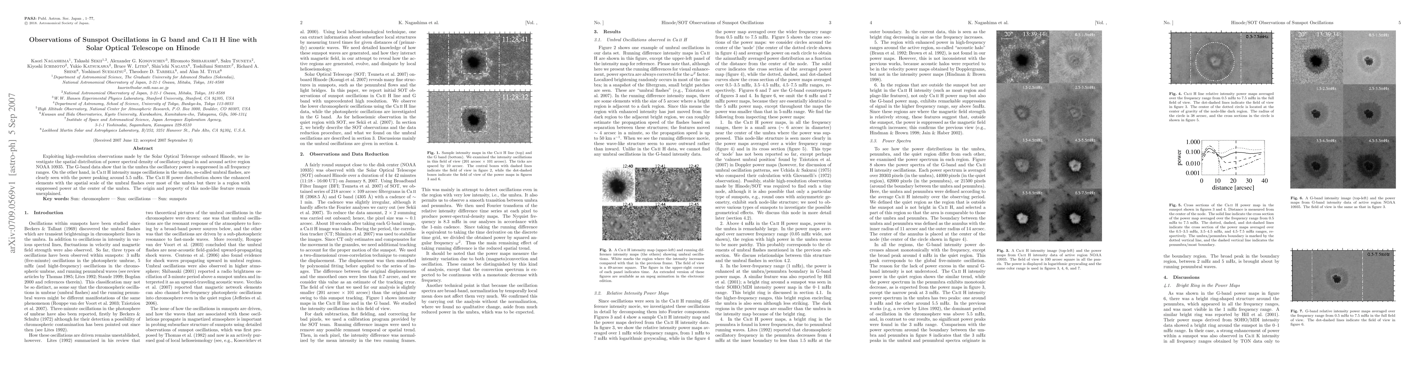 This study uses high-resolution observations from Hinode's Solar Optical Telescope to analyze sunspot oscillations in the G band and Ca II H line. The G-band reveals suppressed oscillatory power in the sunspot umbra, while Ca II H shows clear umbral flashes peaking around 5.5 mHz, with a notable node-like feature of suppressed power at the umbra's center.