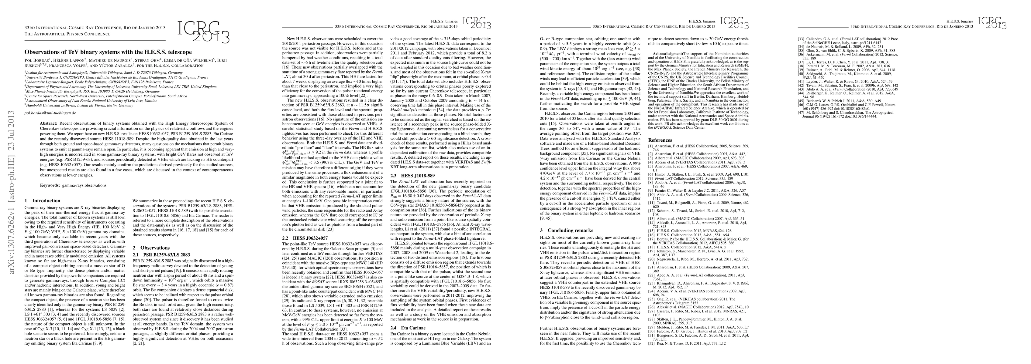Recent observations of binary systems obtained with the H.E.S.S. telescopes are providing crucial information on the physics of relativistic outflows and the engines powering them. We report here on new H.E.S.S. results on HESS J0632+057, PSR B1259-63/LS 2883, Eta Carinae and the recently discovered source HESS J1018-589. Despite the high-quality data obtained in the last years through both ground and space-based gamma-ray detectors, many questions on the mechanisms that permit binary systems to emit at gamma-rays remain open. In particular, it is becoming apparent that emission at high and very-high energies is uncorrelated in some gamma-ray binary systems, with bright GeV flares not observed at TeV energies (e.g. PSR B1259-63), and sources periodically detected at VHEs which are lacking its HE counterpart (e.g. HESS J0632+057). Our results mainly confirm the predictions derived previously for the studied sources, but unexpected results are also found in a few cases, which are discussed in the context of contemporaneous observations at lower energies.