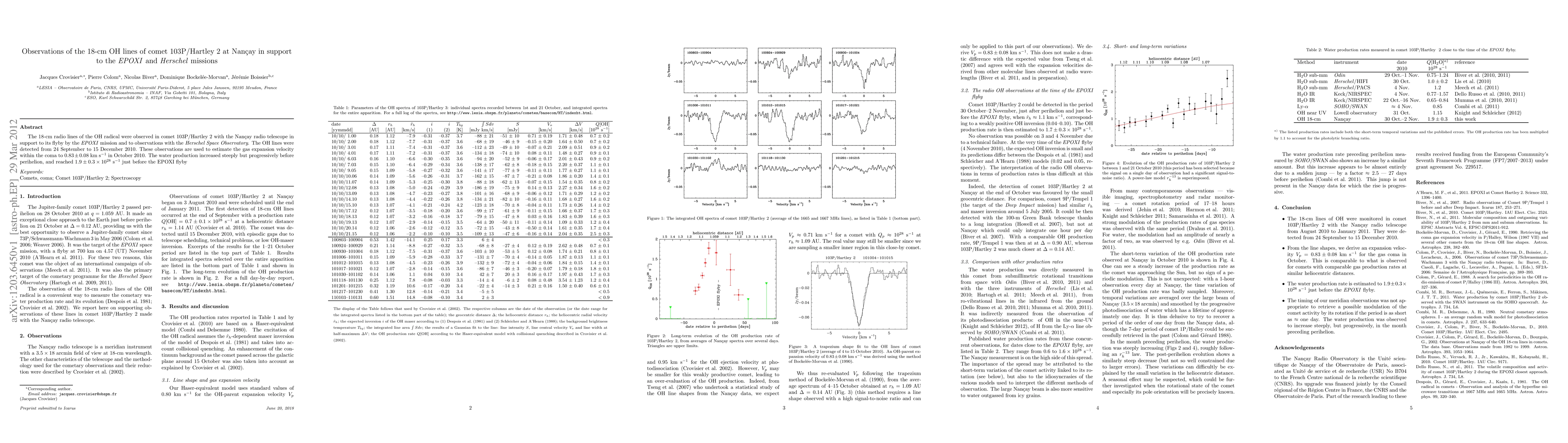 The 18-cm radio lines of the OH radical were observed in comet 103P/Hartley 2 with the Nan\c{c}ay radio telescope in support to its flyby by the EPOXI mission and to observations with the Herschel Space Observatory. The OH lines were detected from 24 September to 15 December 2010. These observations are used to estimate the gas expansion velocity within the coma to 0.83 \pm 0.08 km/s in October 2010. The water production increased steeply but progressively before perihelion, and reached 1.9 \pm 0.3 X 10E28 s-1 just before the EPOXI flyby.