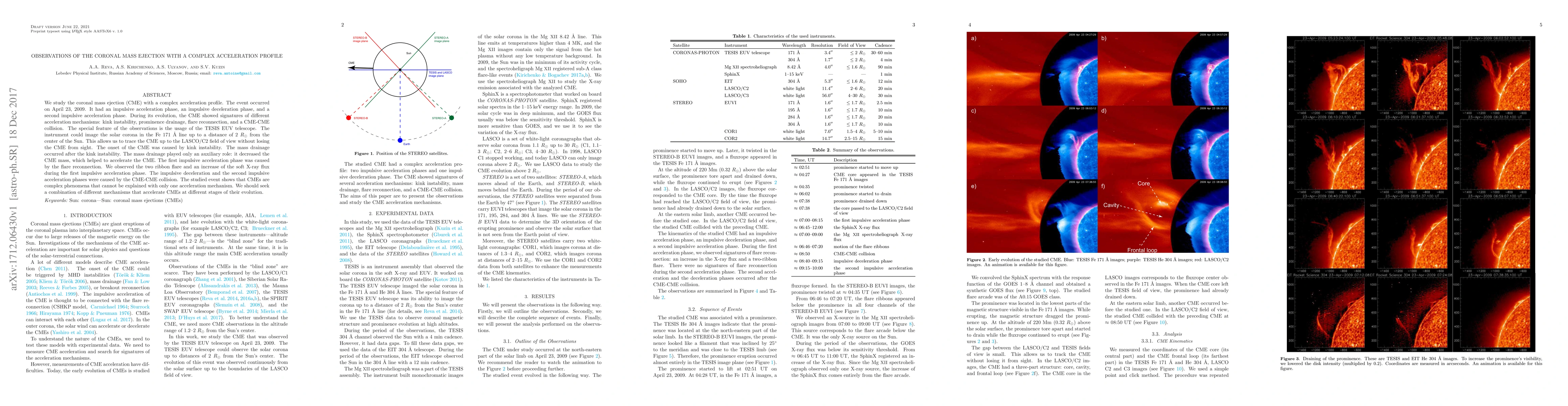 We study the coronal mass ejection (CME) with a complex acceleration profile. The event occurred on April 23, 2009. It had an impulsive acceleration phase, an impulsive deceleration phase, and a second impulsive acceleration phase. During its evolution, the CME showed signatures of different acceleration mechanisms: kink instability, prominence drainage, flare reconnection, and a CME-CME collision. The special feature of the observations is the usage of the TESIS EUV telescope. The instrument could image the solar corona in the Fe 171 \AA\ line up to a distance of 2 $R_\odot$ from the center of the Sun. This allows us to trace the CME up to the LASCO/C2 field of view without losing the CME from sight. The onset of the CME was caused by kink instability. The mass drainage occurred after the kink instability. The mass drainage played only an auxiliary role: it decreased the CME mass, which helped to accelerate the CME. The first impulsive acceleration phase was caused by the flare reconnection. We observed the two ribbon flare and an increase of the soft X-ray flux during the first impulsive acceleration phase. The impulsive deceleration and the second impulsive acceleration phases were caused by the CME-CME collision. The studied event shows that CMEs are complex phenomena that cannot be explained with only one acceleration mechanism. We should seek a combination of different mechanisms that accelerate CMEs at different stages of their evolution.